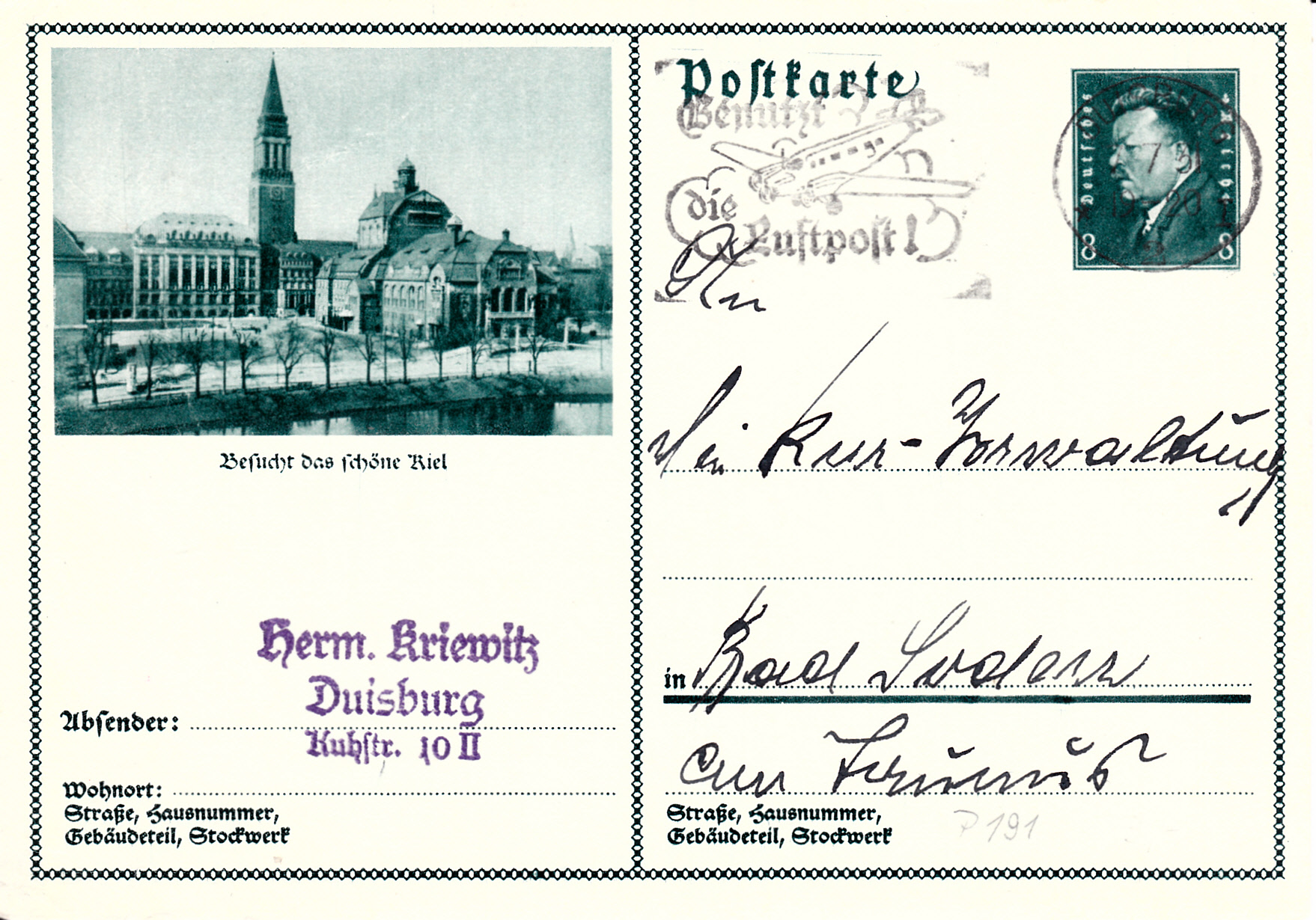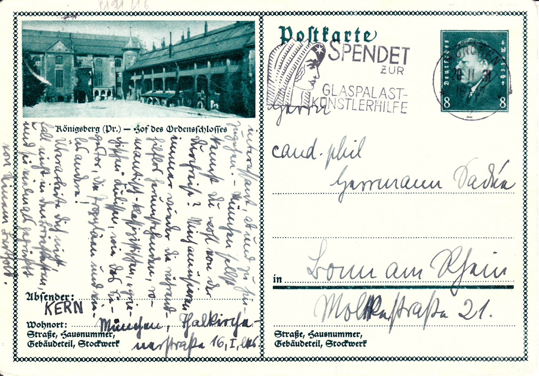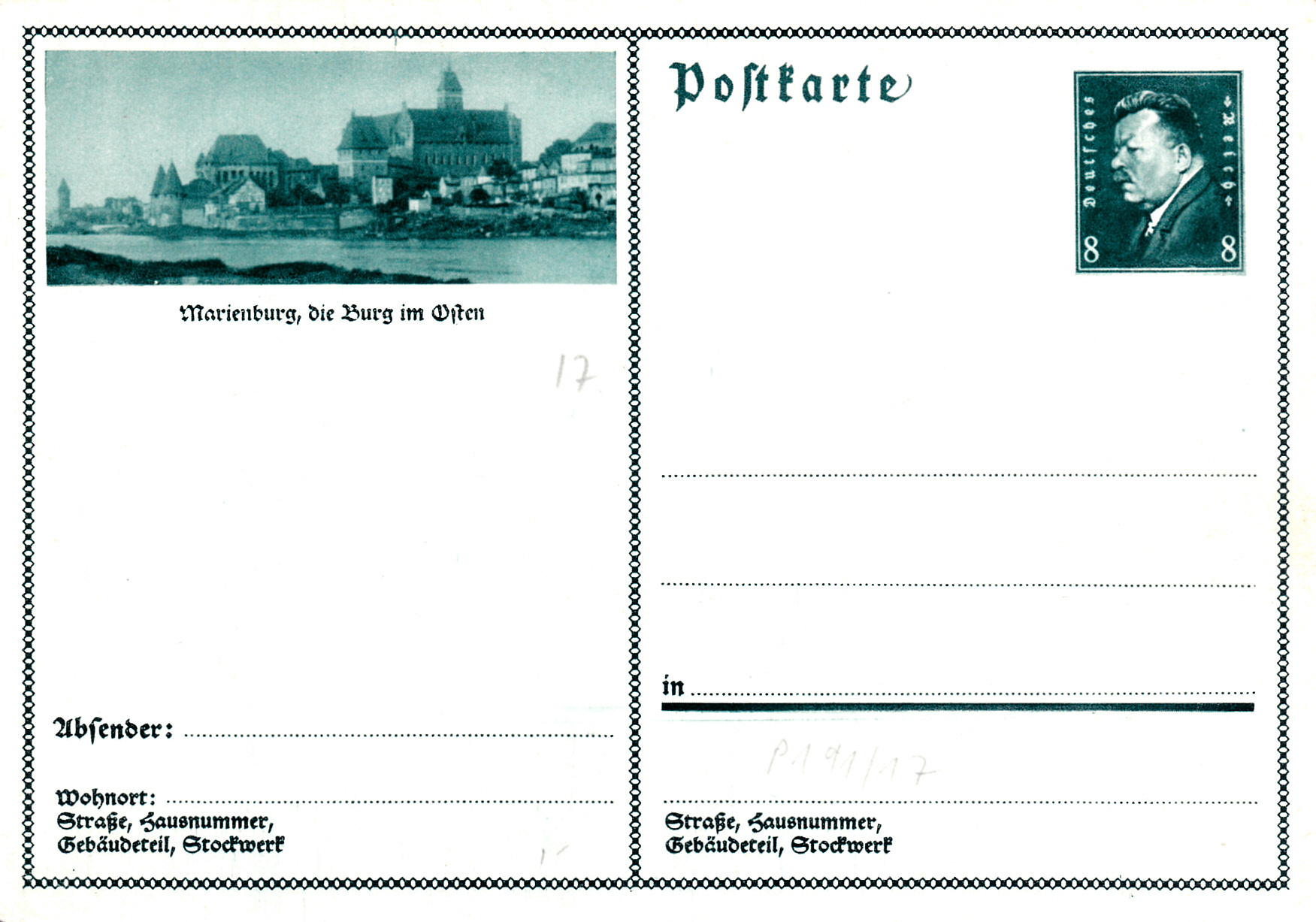 Auf dieser Bildpostkarte (MiNr P 191/17) sehen wir die Marienburg, eine im 13. Jahrhundert erbaute mittelalterliche Ordensburg des Deutschen Ordens am Fluss Nogat, einem Mündungsarm der Weichsel. Heute liegt sie in der polnischen Stadt Malbork (deutsch Marienburg).