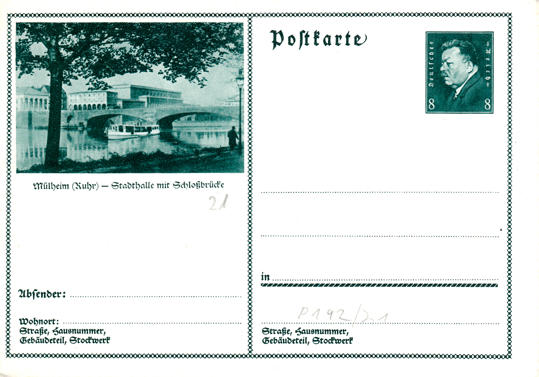 Die Stadthalle mit der Schlossbrücke in Mühlheim an der Ruhr sind auf dieser Karte (MiNr P 192/21) zu sehen.
