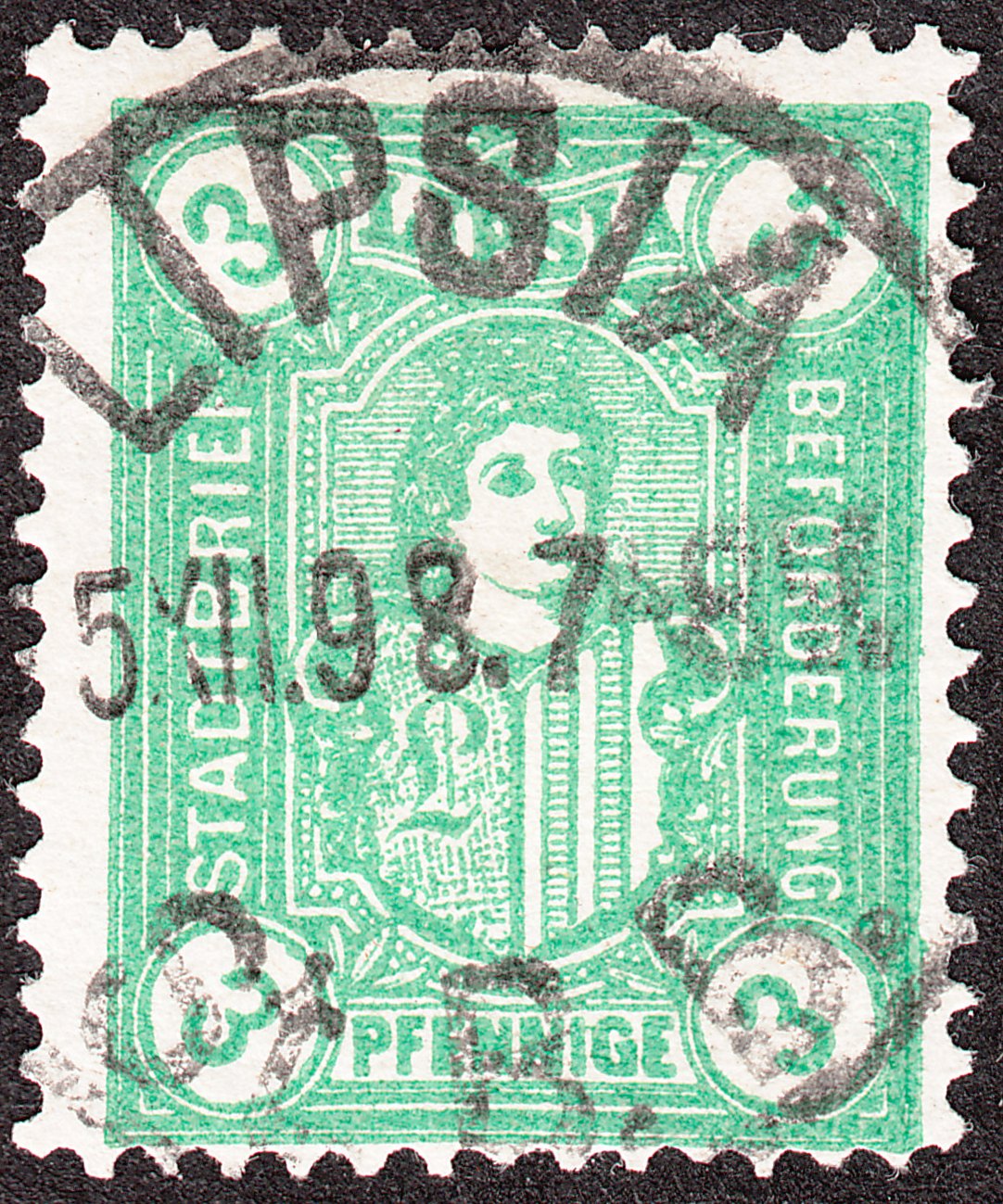 1897 erschien diese MiNr. 3 der Wertstufe 1½ Pf in Blau, gez. 11½, Kindl mit großem Heiligenschein und "geradem" zweiten S in STADTPOST: