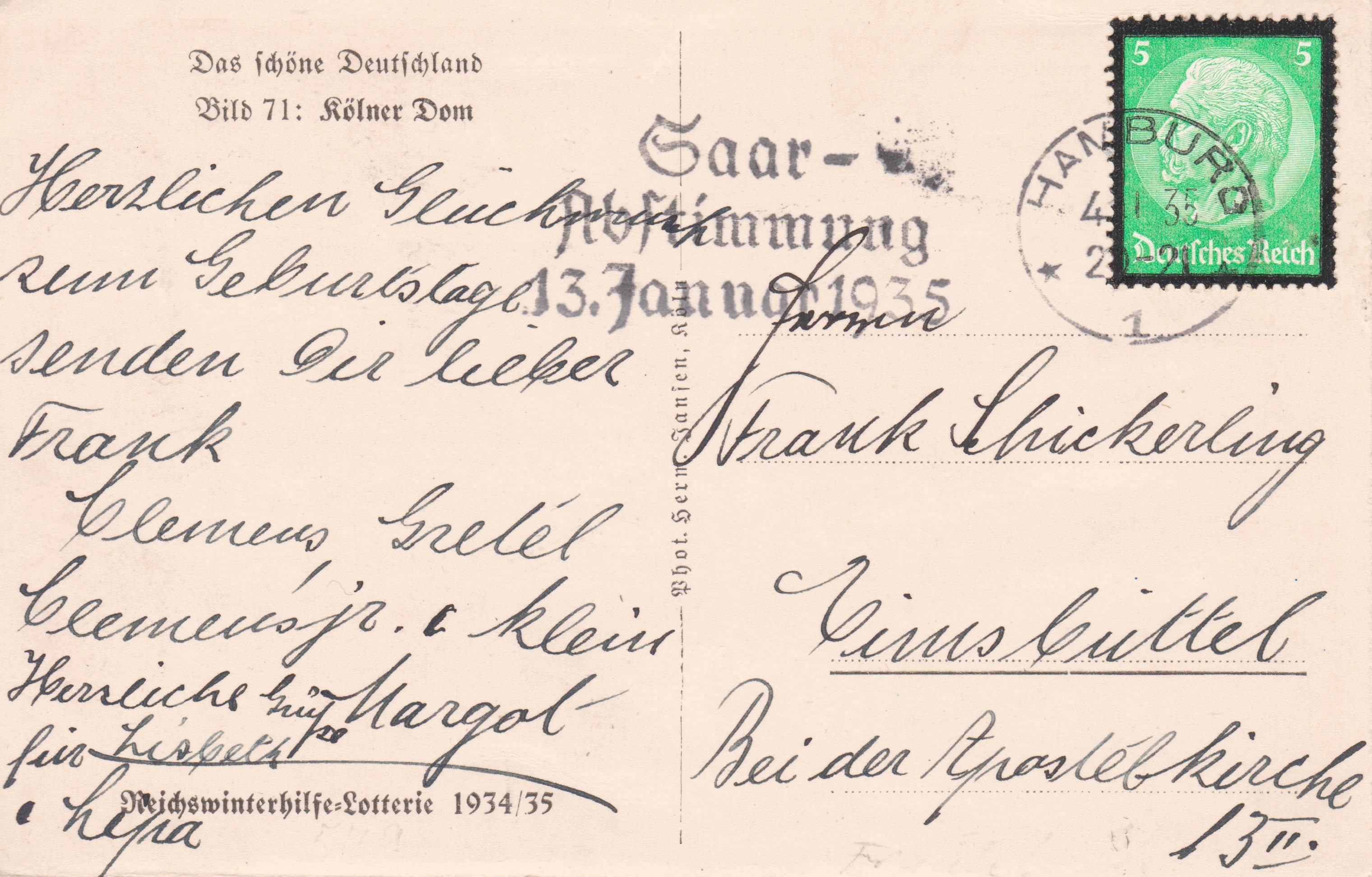 Einzelfrankatur 5 Pf Dauerserie Hindenburg-Medaillon mit Trauerrrand am 24.12.1934 auf Postkarte, aufgegeben in HAMBURG, adressiert nach "Altona":