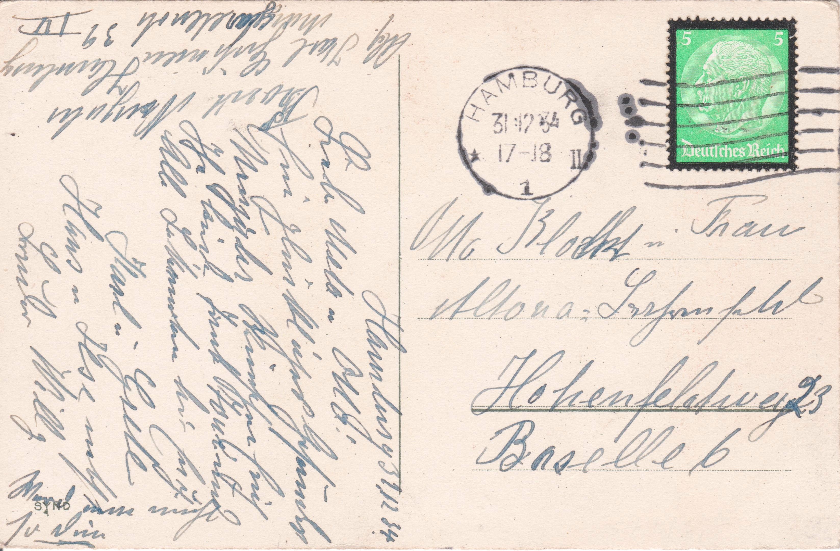 Einzelfrankatur 5 Pf Dauerserie Hindenburg-Medaillon mit Trauerrrand am 31.12.1934 auf Postkarte, aufgegeben in HAMBURG, adressiert nach "Altona":