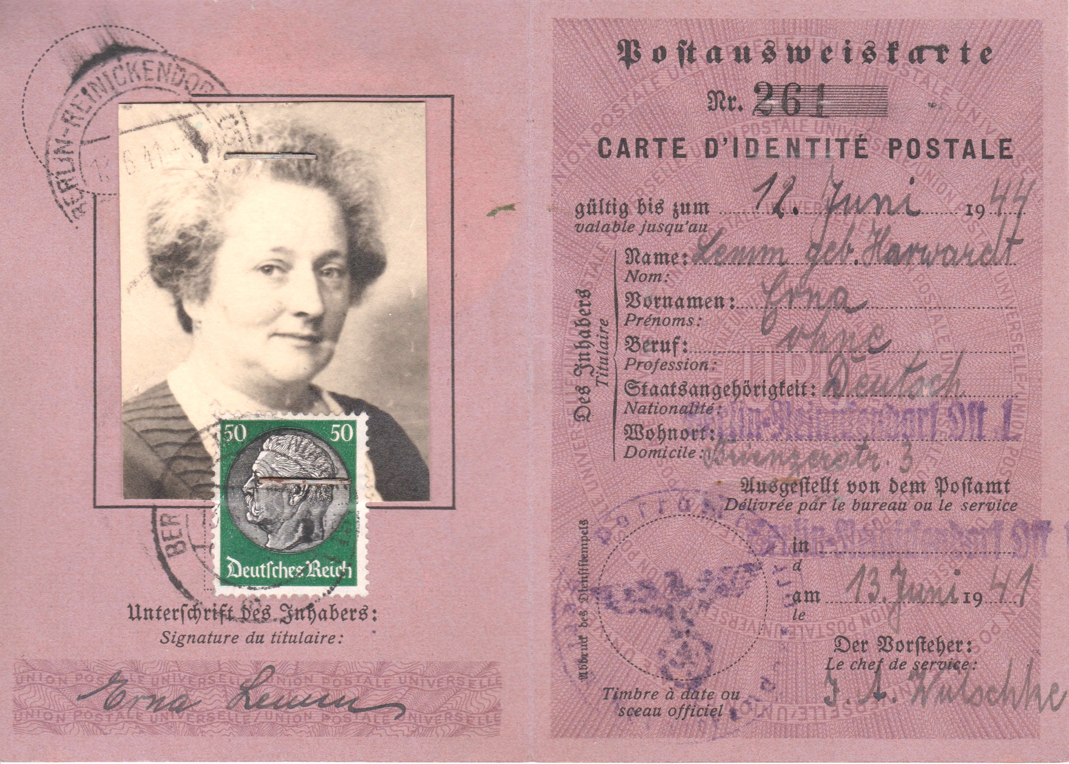 Einzelfrankatur 50 Pf Dauerserie Hindenburg-Medaillon am 13.06.1941 auf Postausweiskarte BERLIN REINICKENDORF OST: