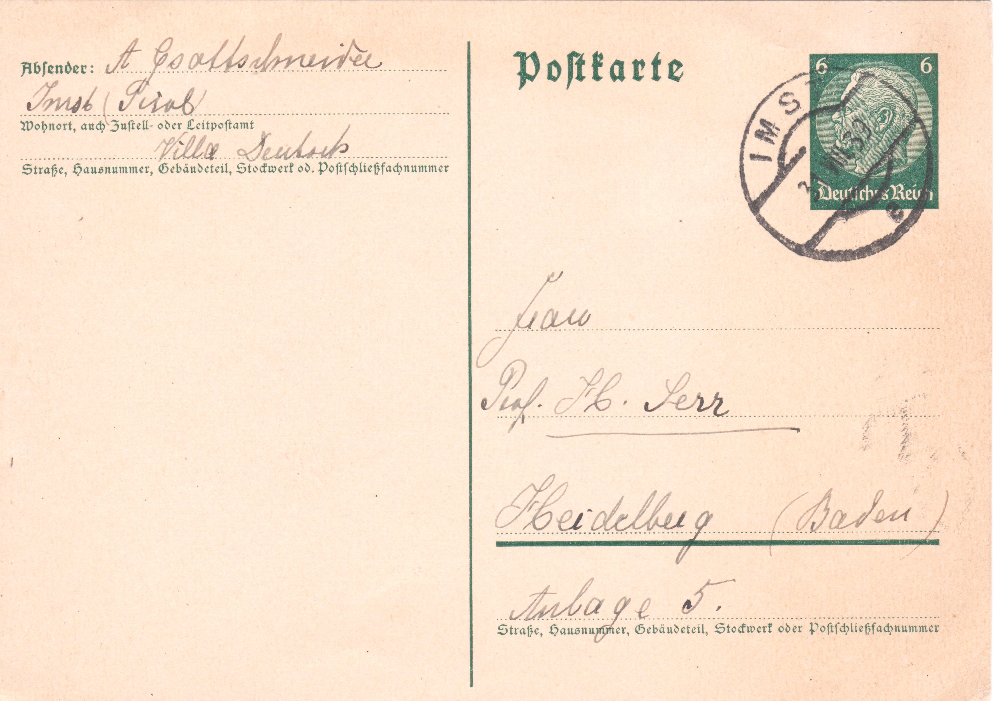 Postkarten 6 Pf am 15.VIII.1939 sowie 31.VIII.1939 aus IMST in Tirol adressiert nach "Heidelberg (Baden)":