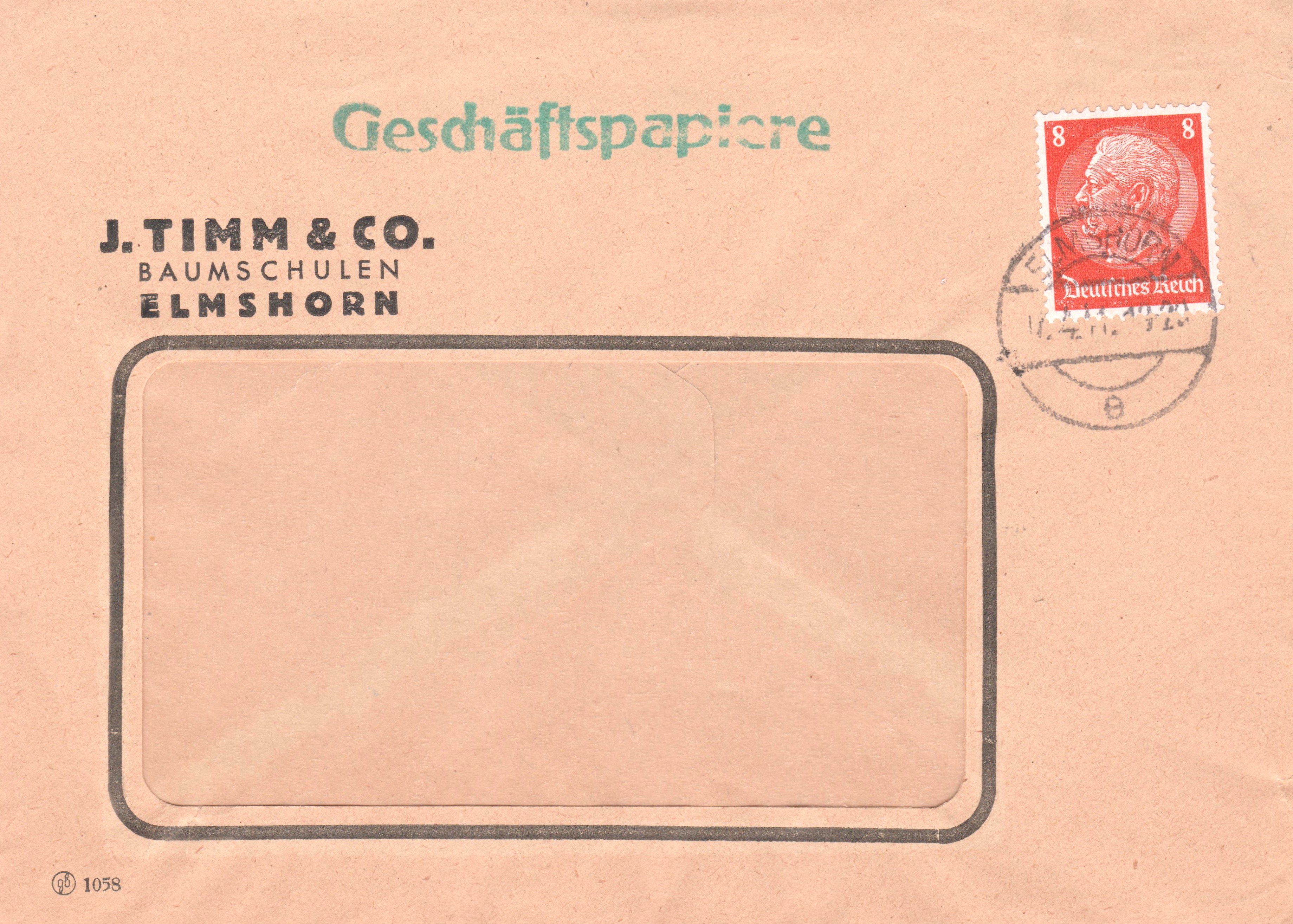 Geschäftspapiere, Portostufe 8 Pf, frankiert per Einzelfrankatur mit 8 Pf Dauerserie Hindenburg, aufgegeen 1941 in ELMSHORN: