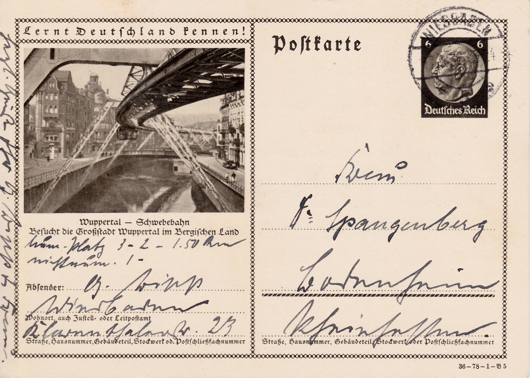 Auch 1936 wurde eine Bildpostkarte (Serie 78 Bild 5) mit der Wuppertaler Schwebebahn aufgelegt. Es wird wieder das bekannte Foto gezeigt.