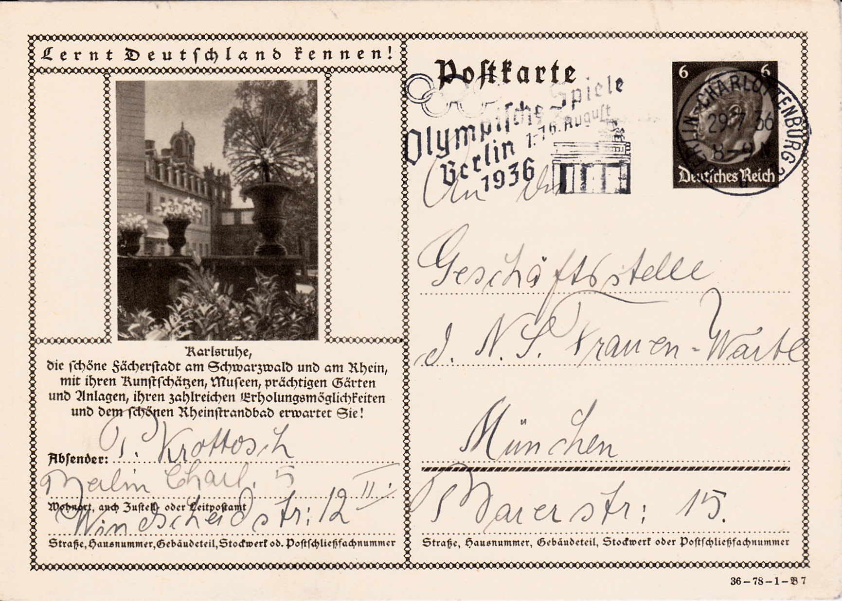 Auch Karlsruhe ist im Jahre 1936 wieder mit einer Bildpostkarte (Serie 78 Bild 7) vertreten und wirbt für einen Besuch der Stadt und im Rheinstrandbad.