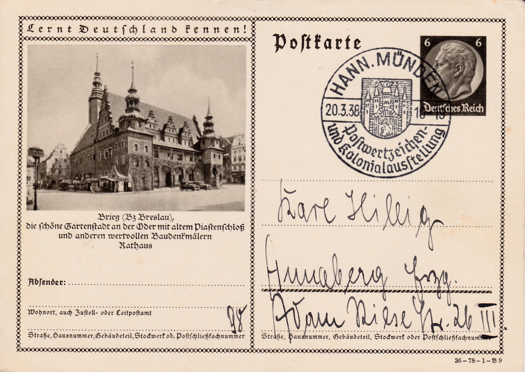 Brieg (Bz Breslau) wirbt auf dieser Karte (Serie 78 Bild 9) mit wertvollen Baudenkmäler und bildet als Beispiel das Rathaus ab. Brieg heißt heute Brzeg und ist eine Kreisstadt im Powiat Brzeski der polnischen Woiwodschaft Opole. Von 1311 bis 1675 war Brieg Residenzstadt des gleichnamigen Herzogtums und von 1907 bis 1945 kreisfreie Stadt im Deutschen Reich.