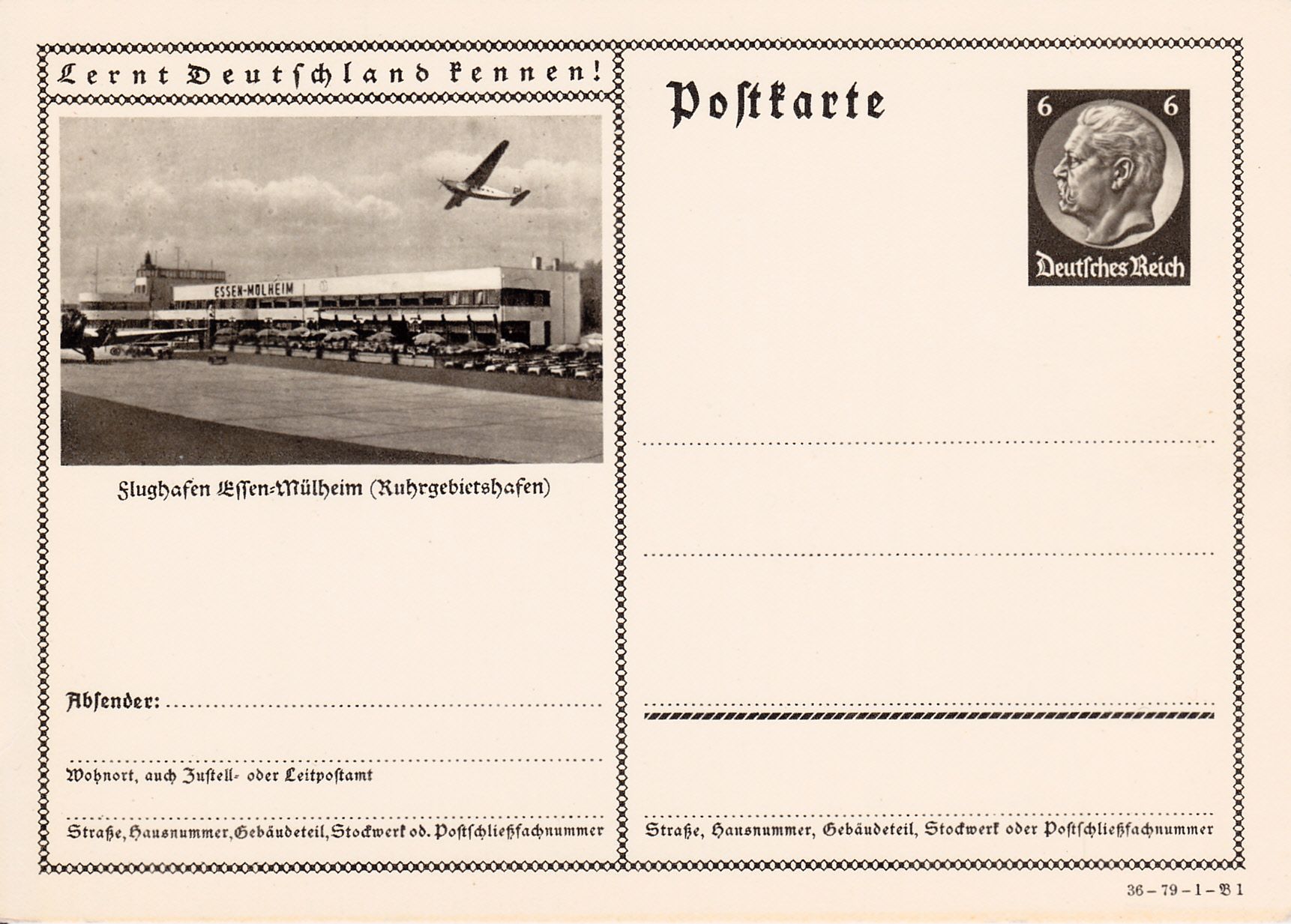 Auf dieser Karte (Serie 79 Bild 1) wird ein Foto mit dem Flughafen Essen-Mülheim gezeigt. Er erhielt 1938 den Namen Rhein-Ruhr-Flughafen und zählte zu den ersten europäischen Flughäfen mit einer befestigten Start- und Landebahn.