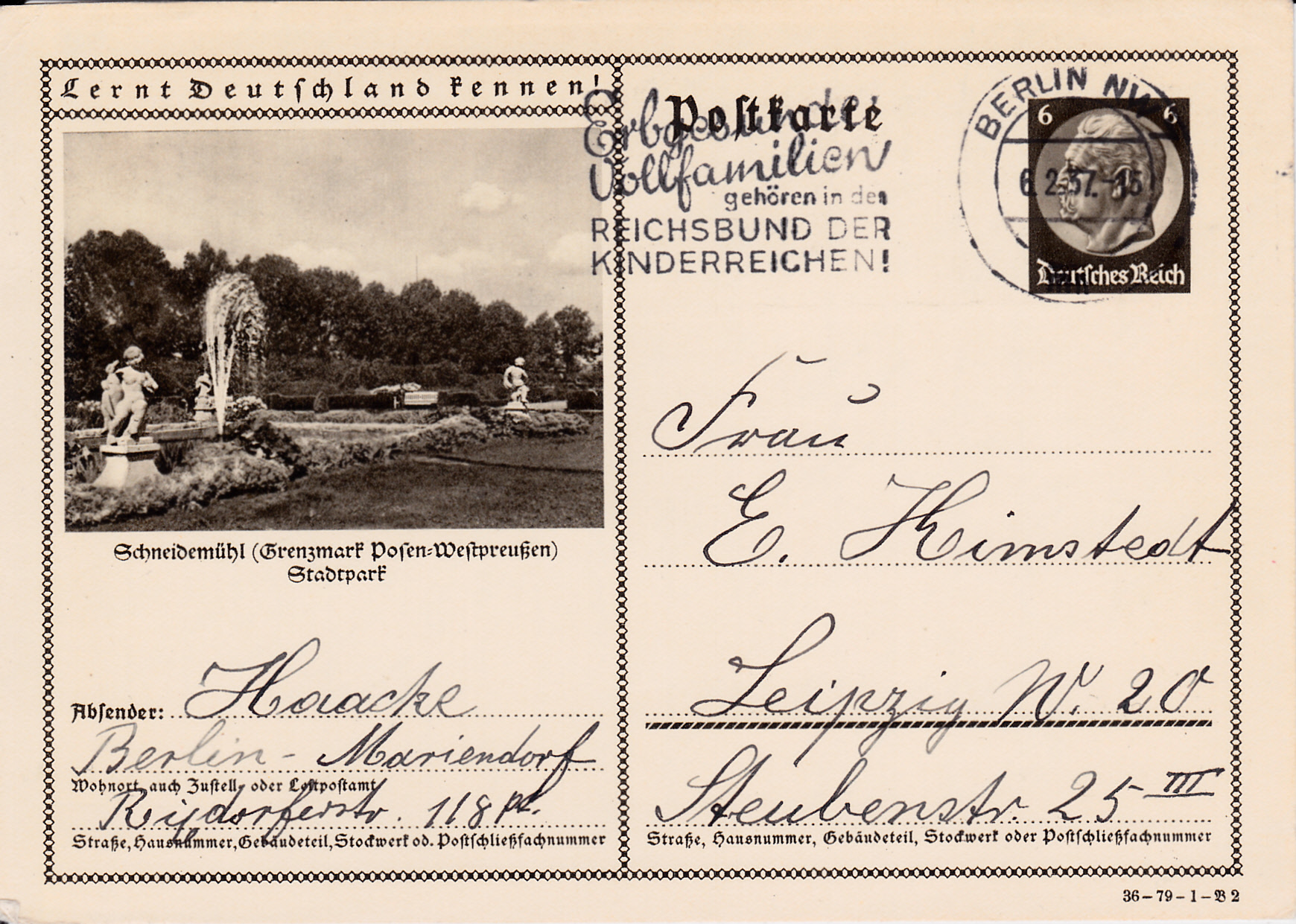 Schneidemühl (heute Piła, eine Stadt in der polnischen Woiwodschaft Großpolen) zeigt 1936 auf einer Bildpostkarte (Serie 79 Bild 2) ein Foto mit einer Ansicht aus dem Stadtpark.
