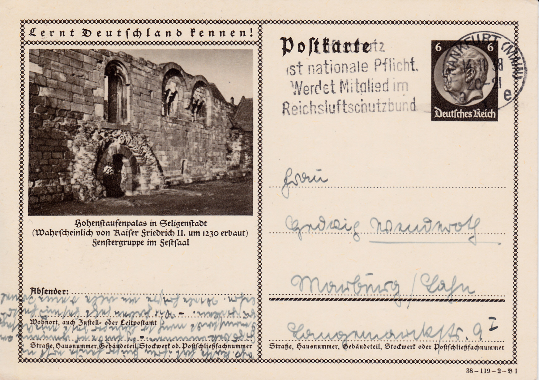 Seligenstadt bildet auf einer Karte (Serie 119 Platte 2 Bild 1) ein Foto mit einer Fenstergruppe aus dem ehemaligen Hohenstaufenpalas aus dem Mittelalter ab.