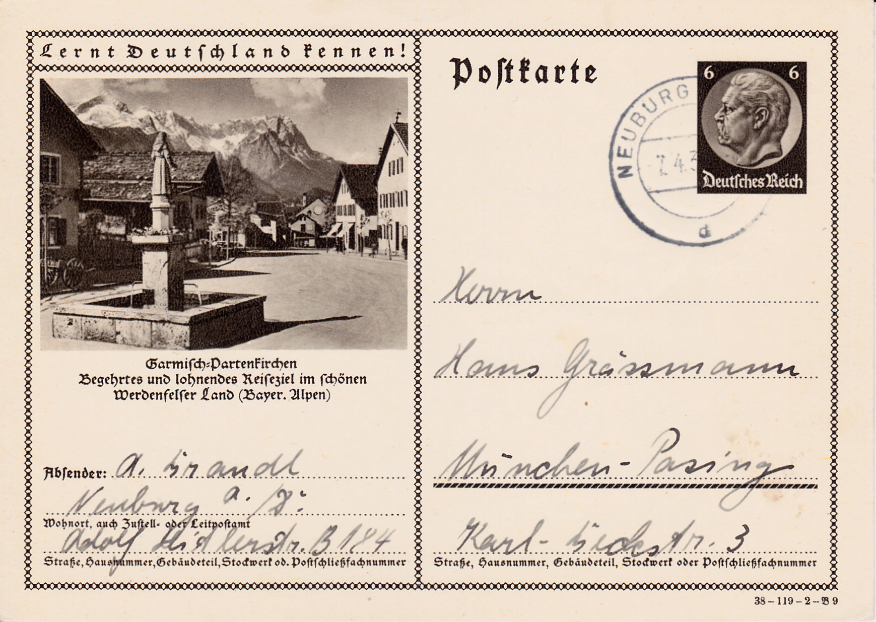 Garmisch-Partenkirchen zeigt auf dieser Karte (Serie 119 Platte 2 Bild 9) eine Ansicht mit dem Antoniusbrunnen im Vordergrund und mit den Bergen Alpspitze und Zugspitze im Hintergrund.