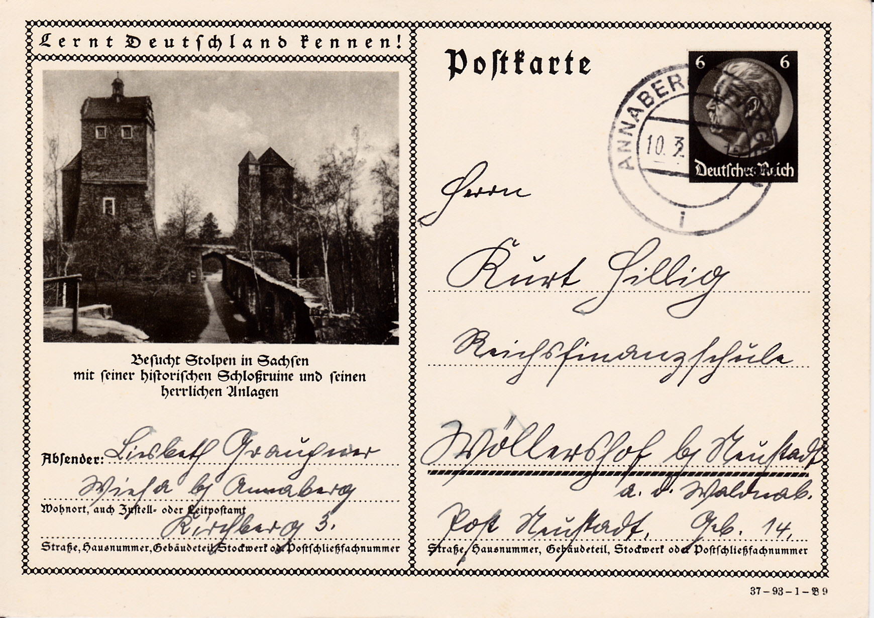 Stolpen in Sachsen zeigt auf einer Bildpostkarte 1937 (Serie 93 Bild 9) die Burgruine Schloss Stolpen.