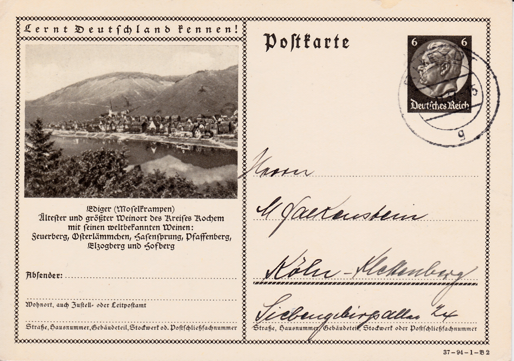 Der Weinort Ediger (seit 7. Juni 1969 Ediger-Eller) wirbt auf dieser Karte (Serie 94 Bild 2) für seine bekannten Weine und nennt auch einige der Weinlagen.