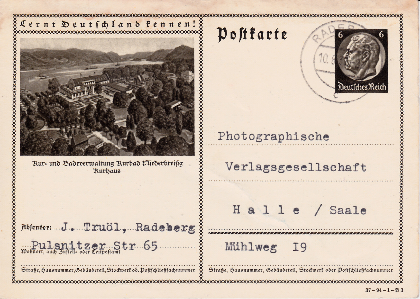 Es gibt für Bad Niederbreisig noch eine dritte Karte (Serie 94 Bild 3) im Jahrgang 1937. Sie zeigt ein Luftbild mit dem Kurhaus.