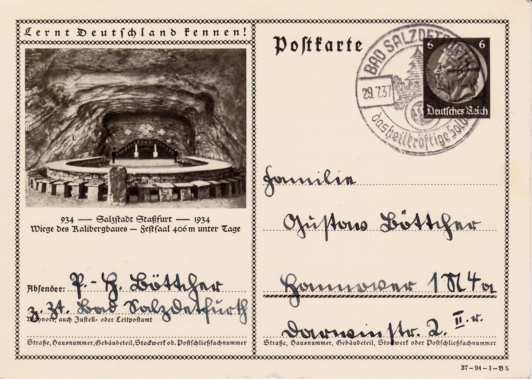 Staßfurt macht mit dem Festsaal in einem Kalibergwerk auf dieser Karte (Serie 94 Bild 5) auf den Kalibergbau der Region aufmerksam.