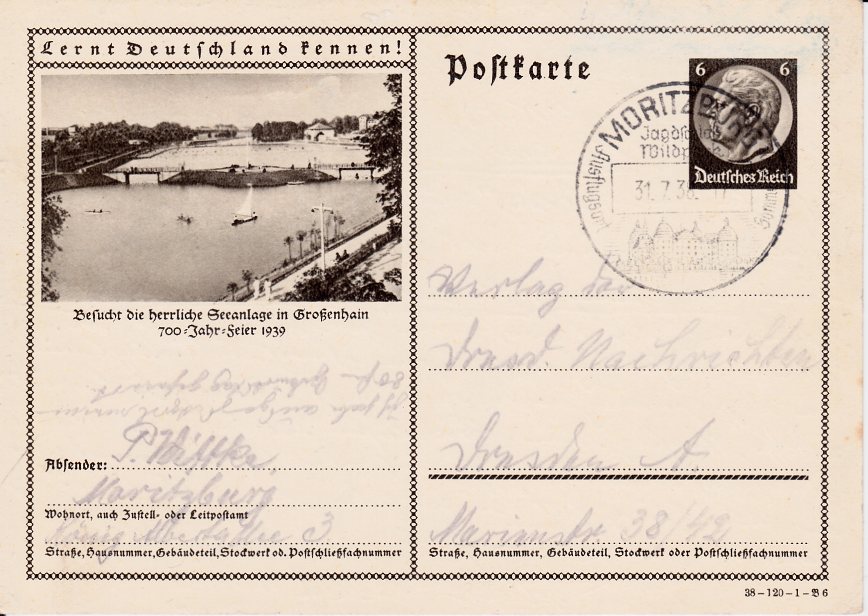 Großenhain macht auf dieser Bildpostkarte (Serie 120 Bild 6) Werbung für seine 700-Jahr-Feier und zeigt seine Seenanlage.
