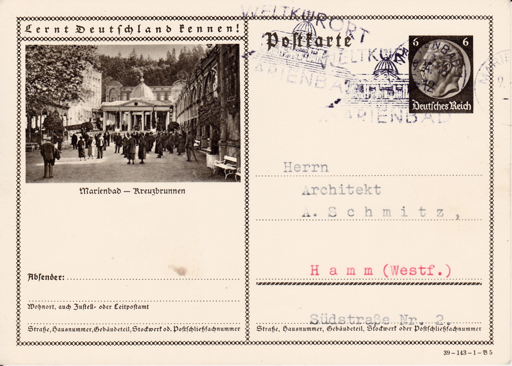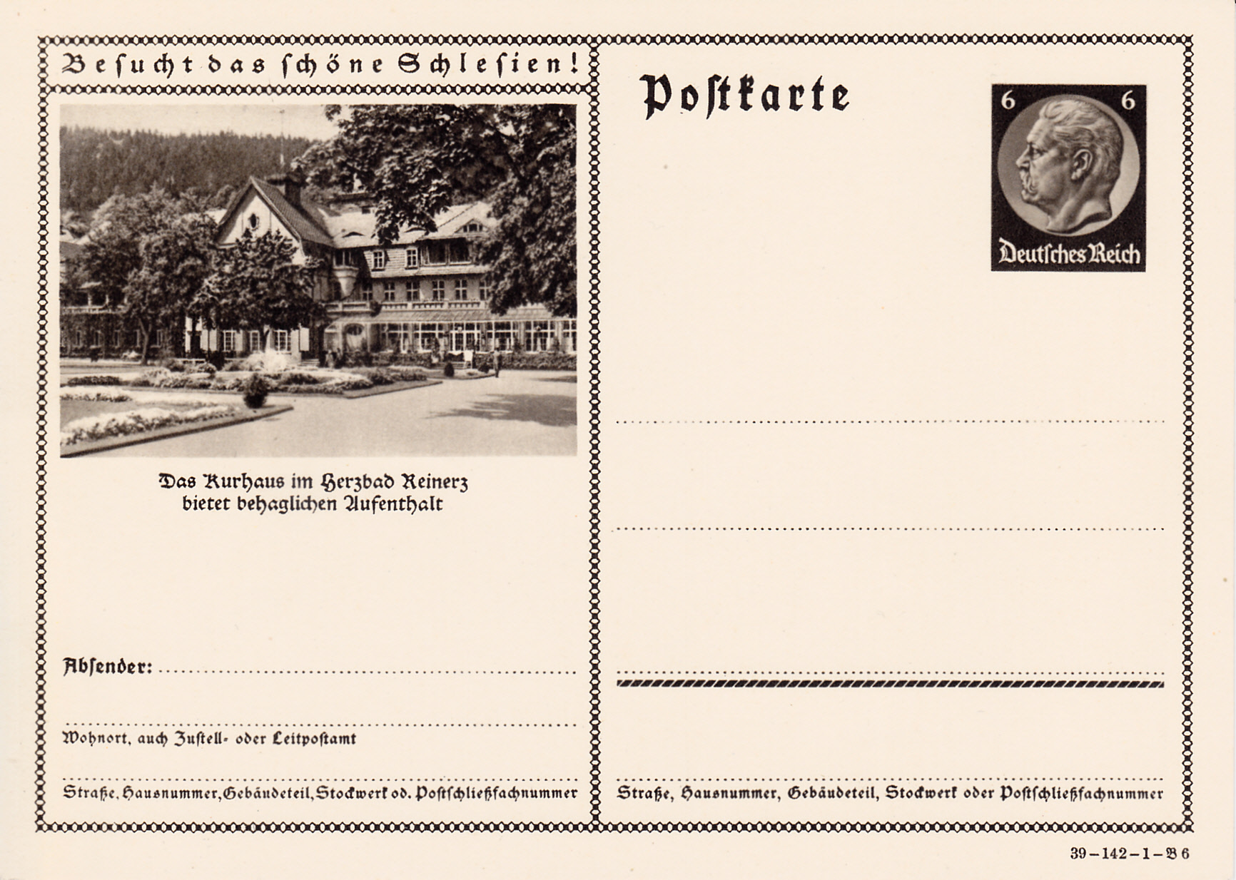 Bad Reinerz ist 1939 mit einer Abbildung des Kurhauses auf dieser Karte (Serie 142 Bild 6) vertreten. Bad Reinerz heißt heute Duszniki-Zdrój und ist eine Stadt im Powiat Kłodzki in der Woiwodschaft Niederschlesien in Polen. Die Stadt zählt zu den ältesten Kurorten Niederschlesiens. Wegen der Heilwirkung der natürlichen Kohlensäurebäder entwickelte sich der Kurort Anfang des 20. Jahrhunderts zu einem der bedeutendsten Herzheilbäder Europas.
