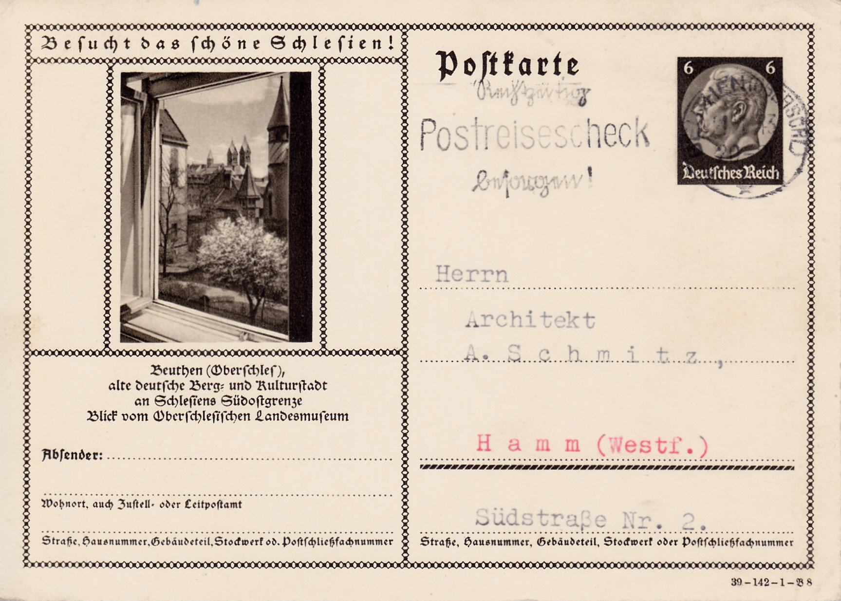 Beuthen (Oberschlesien) zeigt auf dieser Karte (Serie 142 Bild 8) einen Ausblick aus einem Fenster des Oberschlesischen Landesmuseums. Beuthen heißt heute Bytom und ist eine kreisfreie Großstadt in der polnischen Woiwodschaft Schlesien.