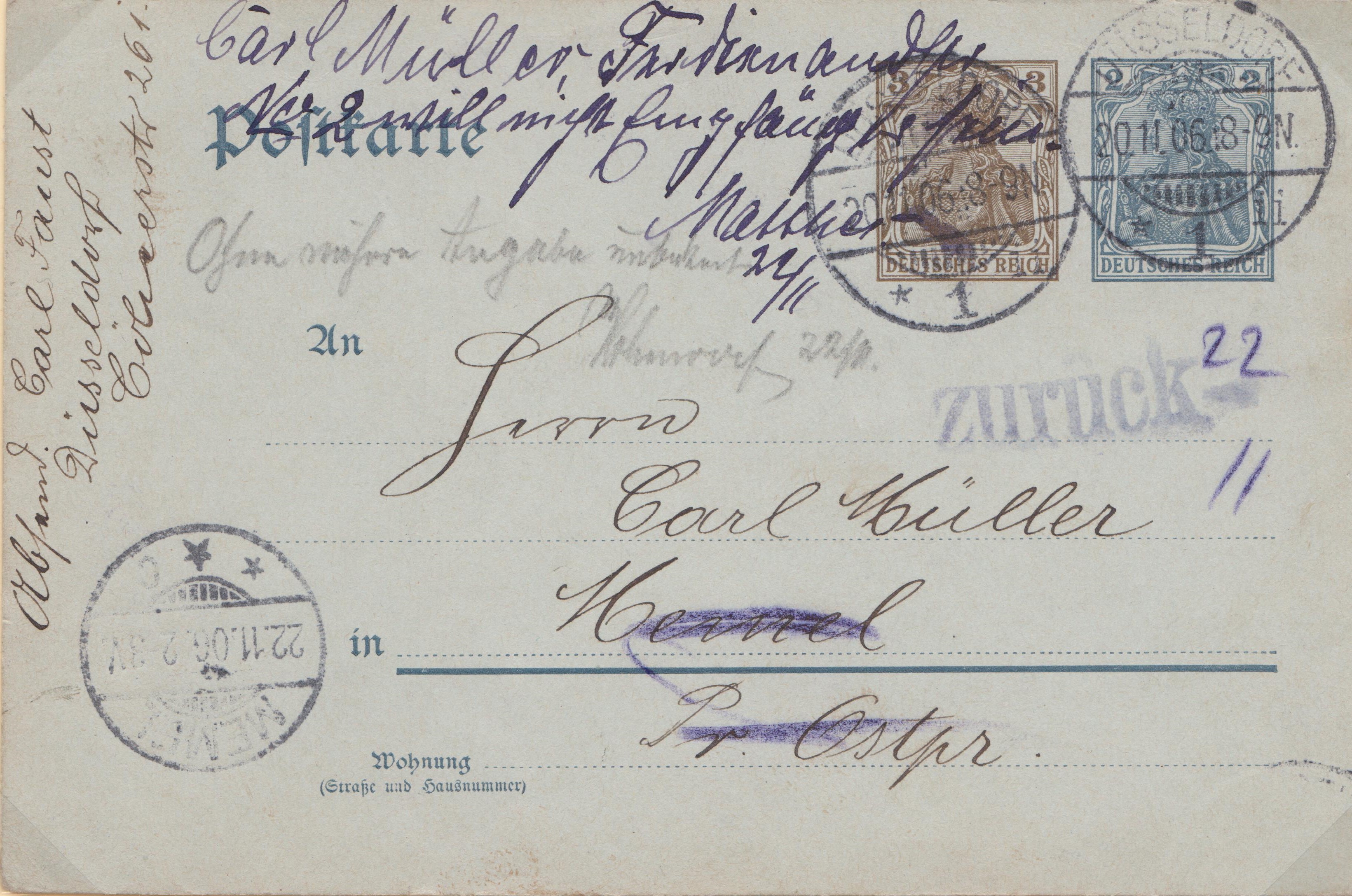 Postkarte im Fernverkehr von Düsseldorf nach Memel: