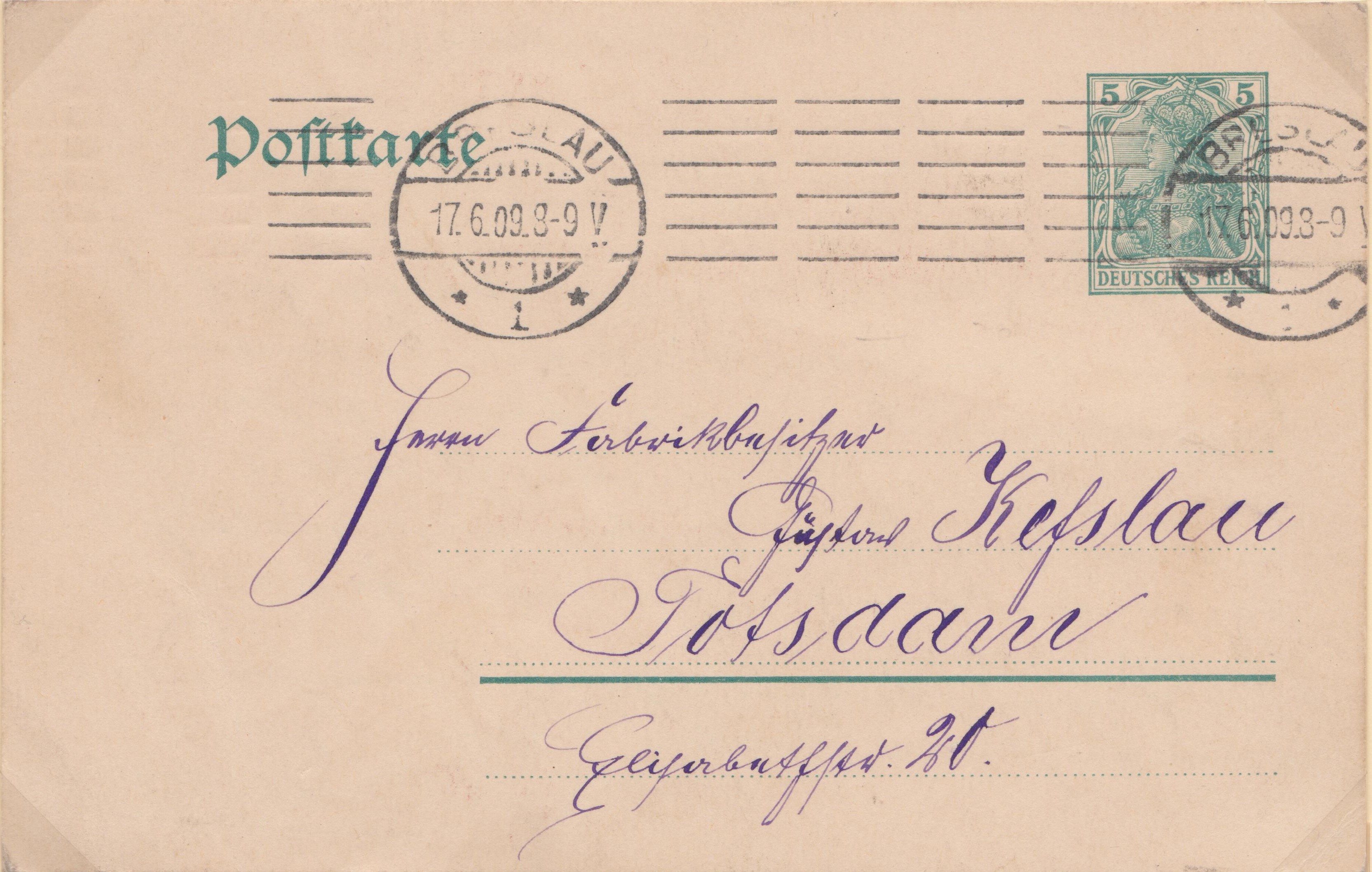 Ganzsache Germania 5 Pf, MICHEL P 78 mit Wasserzeichen "DR/III/8", aufgegeben am 17.06.1909 in BRESLAU: