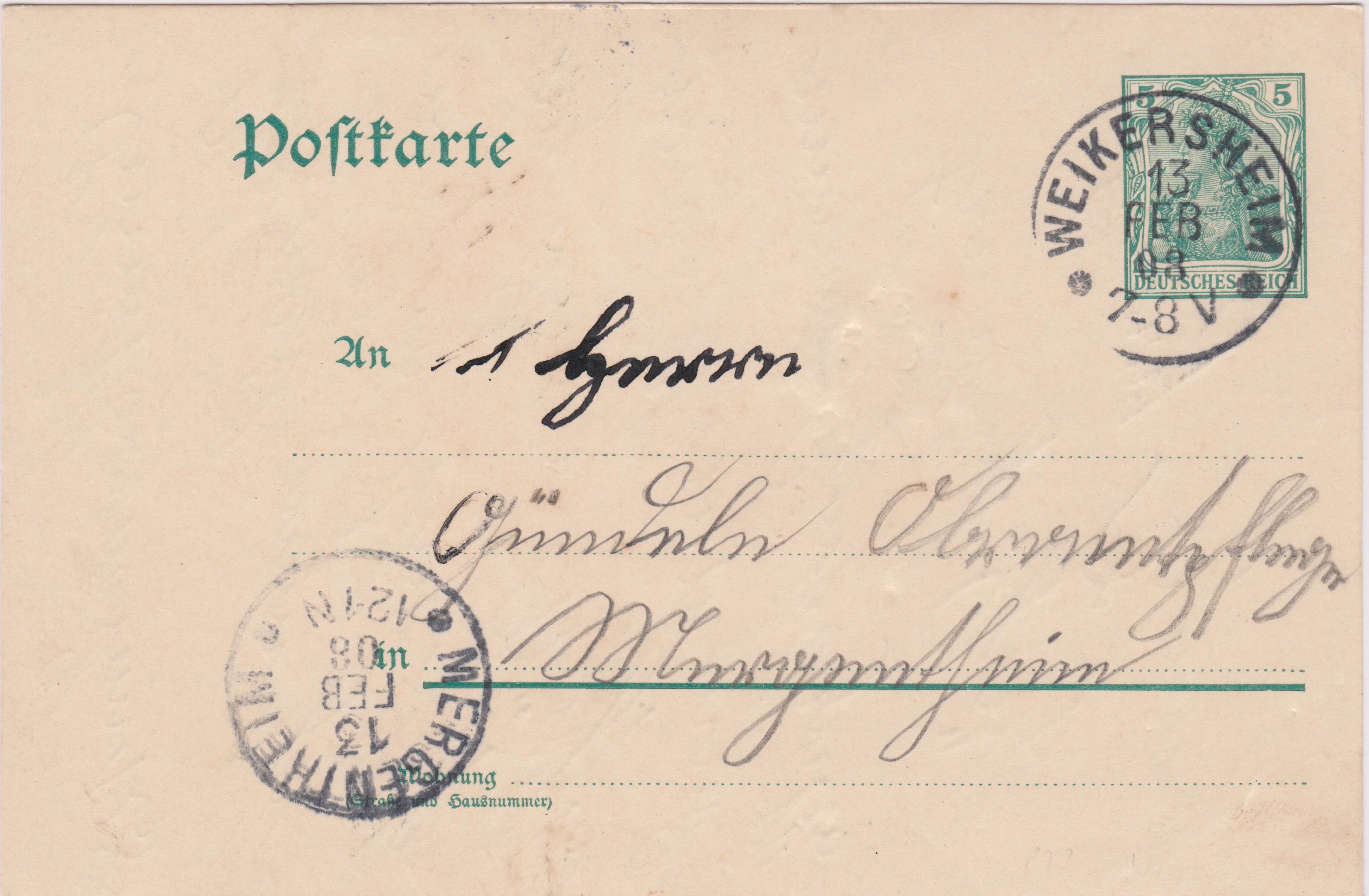 Ganzsache Germania 5 Pf, MICHEL P 73 mit Wasserzeichen "DR/III/7", aufgegeben am 13.02.1908 in WEIKERSHEIM: