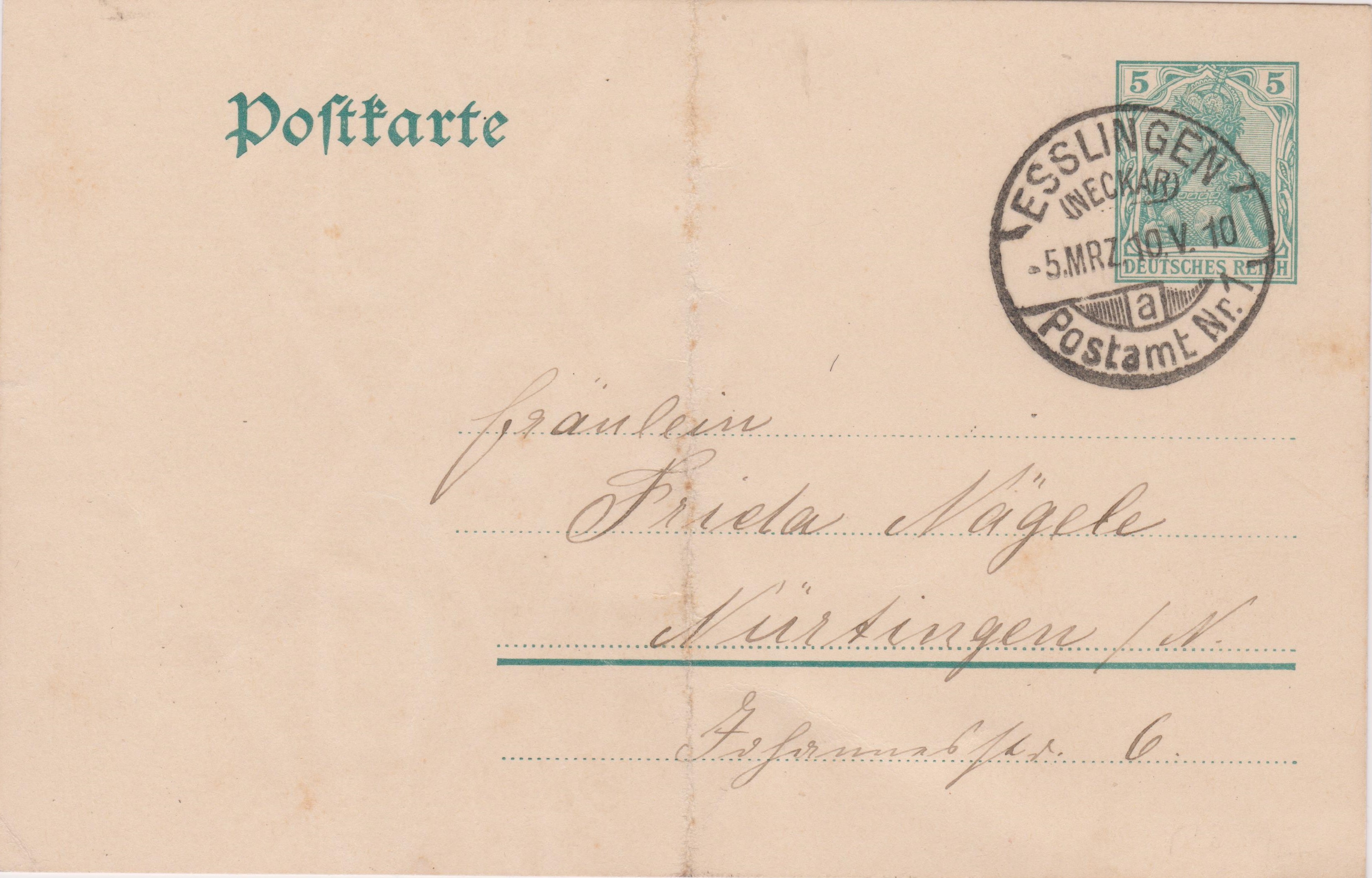 Ganzsache Germania 5 Pf, MICHEL P 78 mit Wasserzeichen "DR/III/9", aufgegeben am 05.03.1910 in ESSLINGEN: