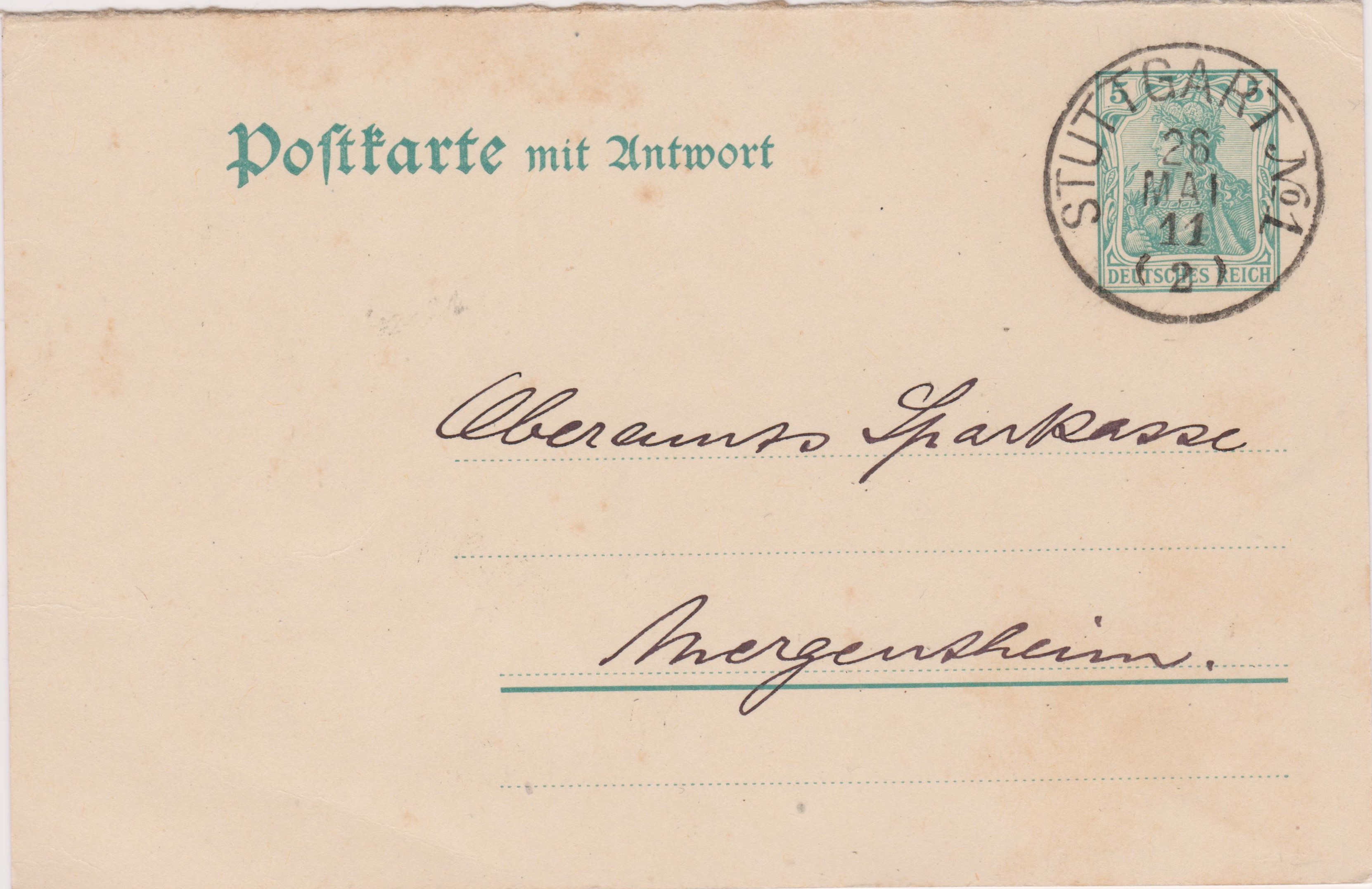 Ganzsache Germania 5 Pf "Postkarte mit Antwort", MICHEL P 81 F mit Wasserzeichen "DR/II/9", aufgegeben am 26.05.1911 in STUTTGART: