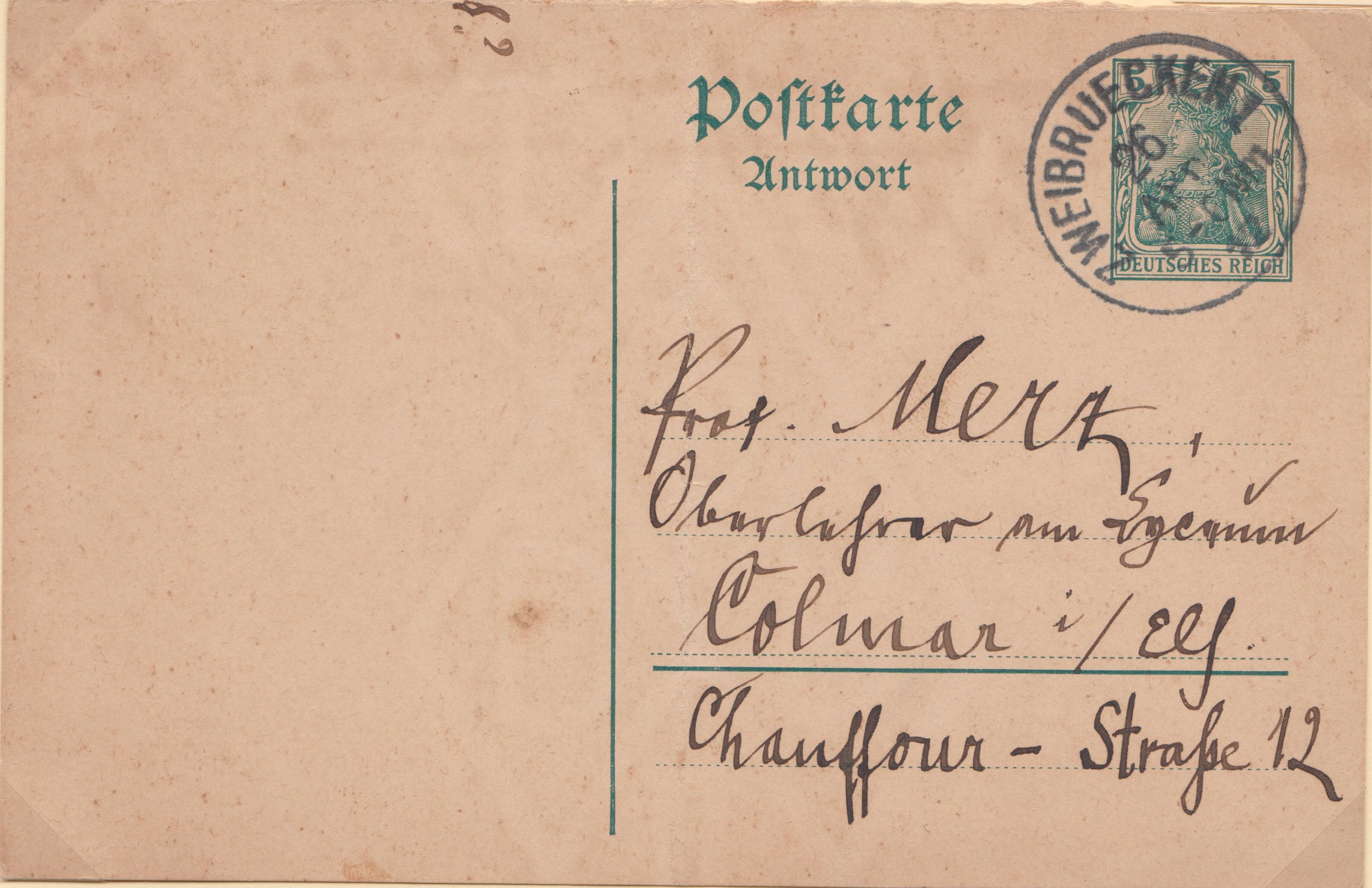 Ganzsache Germania 5 Pf "Postkarte Antwort", MICHEL P 92 A mit Wasserzeichen "DR/II/9", aufgegeben am 26.04.1912 in ZWEIBRUECKEN: