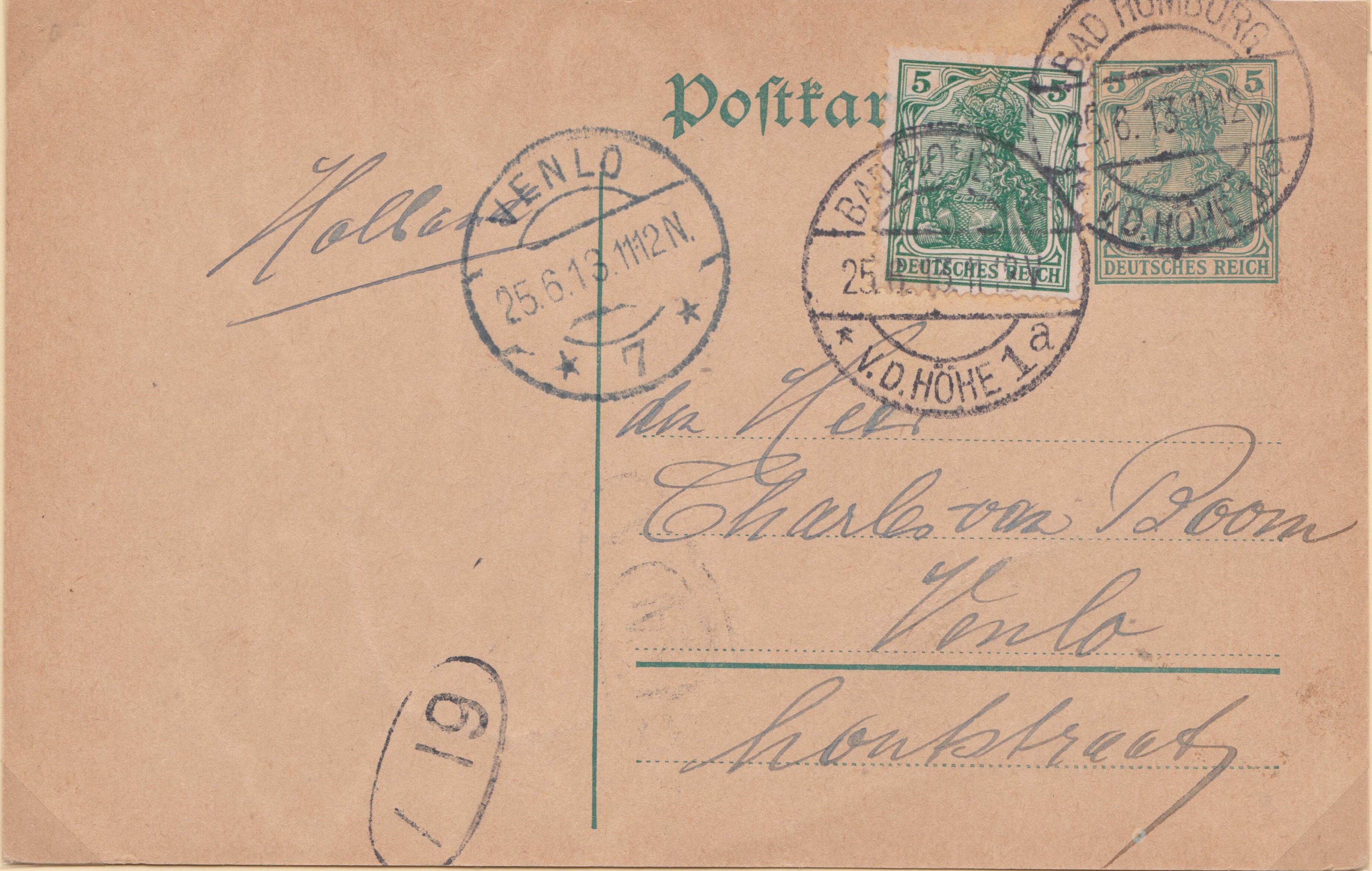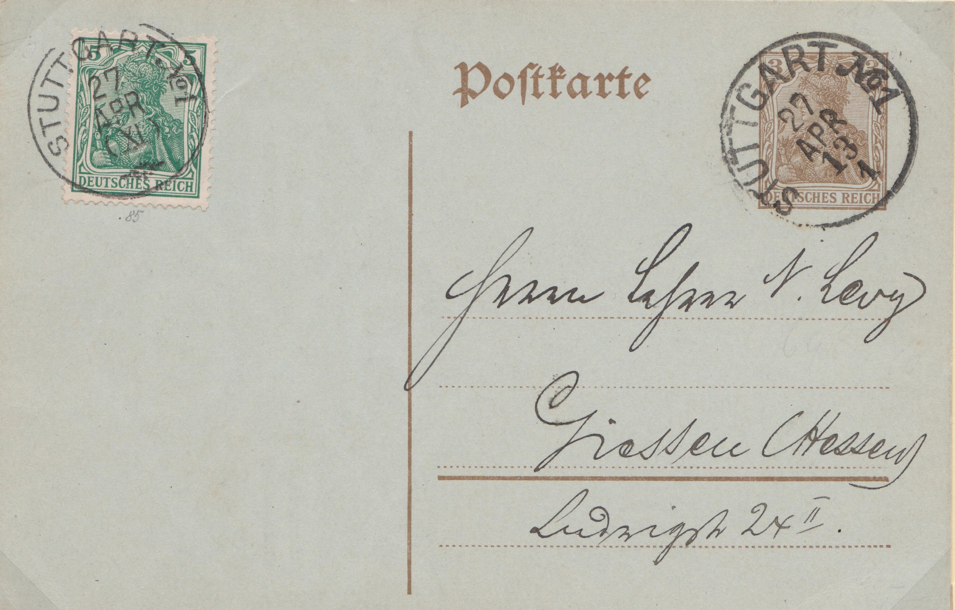 Ganzsache MICHEL P 89 mit eingedrucktem Postwertzeichen Germania 3 Pf und Zusatzfrankatur Germania 5 Pf am 27.04.1913 aufgegeben in STUTTGART, gelaufen nach Giessen:
