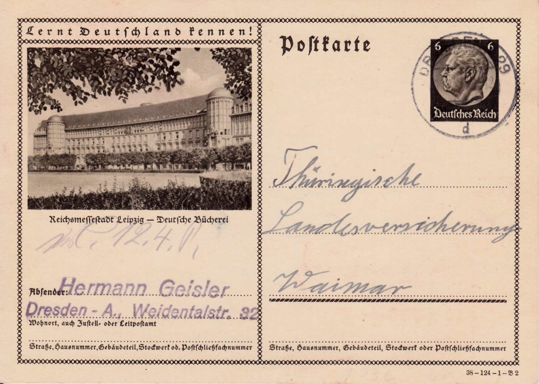 Auf einer zweiten Bildpostkarte (Serie 124 Bild 2) stellt Leipzig das Gebäude der "Deutschen Bücherei" vor. Die Deutsche Bücherei in Leipzig war eine Vorgängereinrichtung der Deutschen Nationalbibliothek, deren Teil sie heute ist.