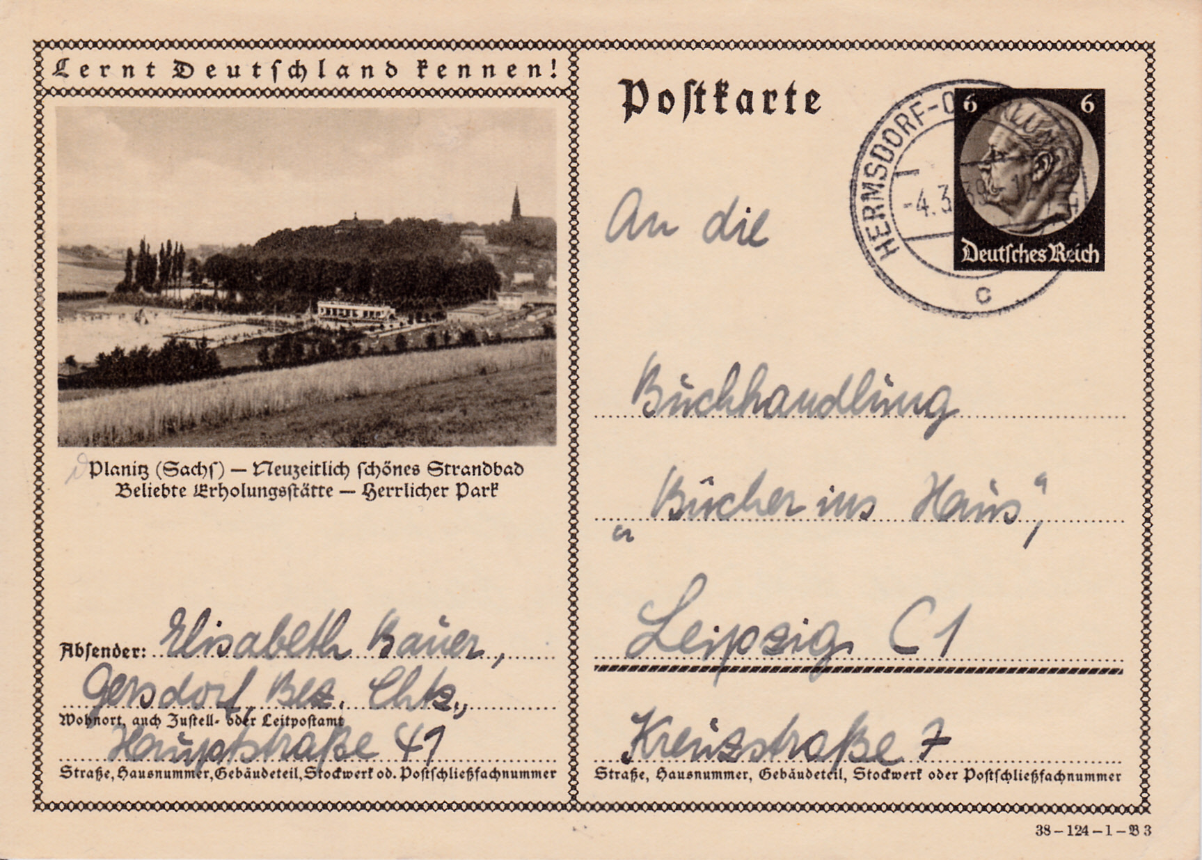 Planitz in Sachsen macht auch dieser Karte (Serie 124 Bild 3) Werbung für sein "neuzeitlich schönes Strandbad". Am 1. Januar 1944 wurde die Stadt Planitz nach Zwickau eingemeindet.