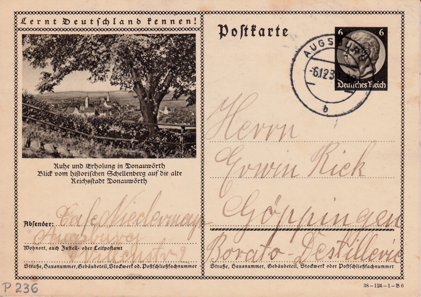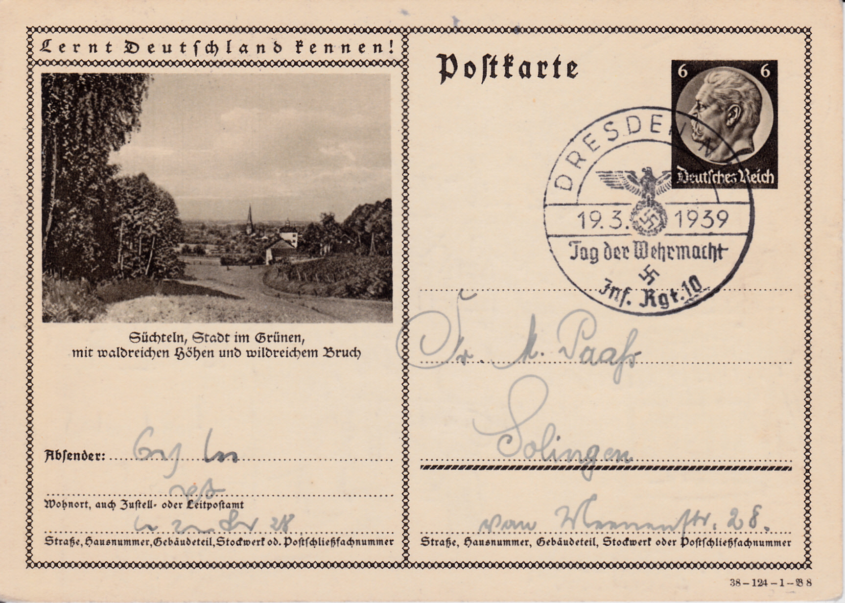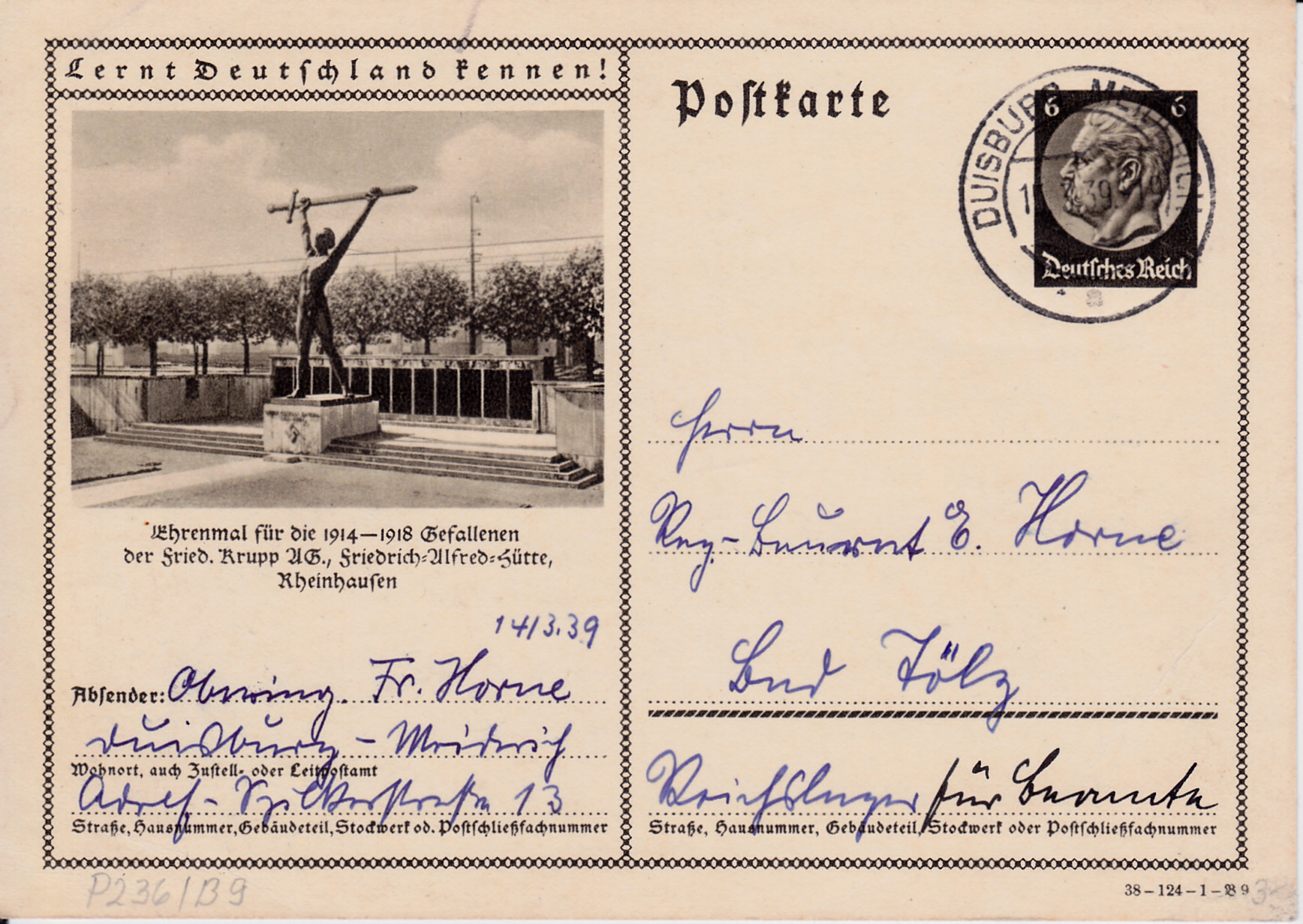 Rheinhausen (heute ein Bezirk der Stadt Duisburg) zeigt auf dem Foto dieser Karte (Serie 124 Bild 9) wieder das Ehrenmal für die Gefallenen der Friedrich Krupp AG im 1.Weltkrieg. Ein fast identisches Bild wurde bereits +1937 für eine Bildpostkarte verwendet.