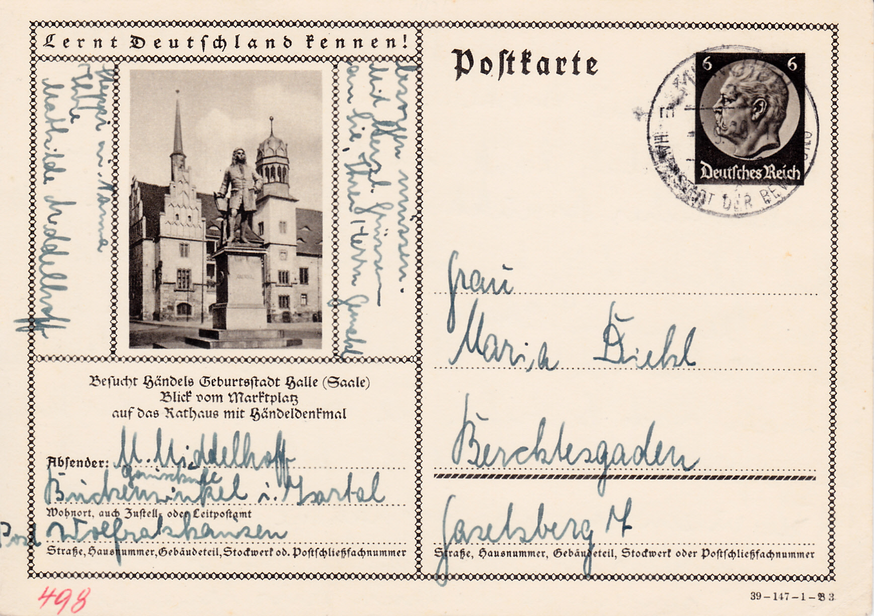 Auf einer weiteren Karte (Serie 147 Bild 3) zeigt Halle an der Saale eine Ansicht vom Marktplatz mit dem Rathaus und dem Händeldenkmal.