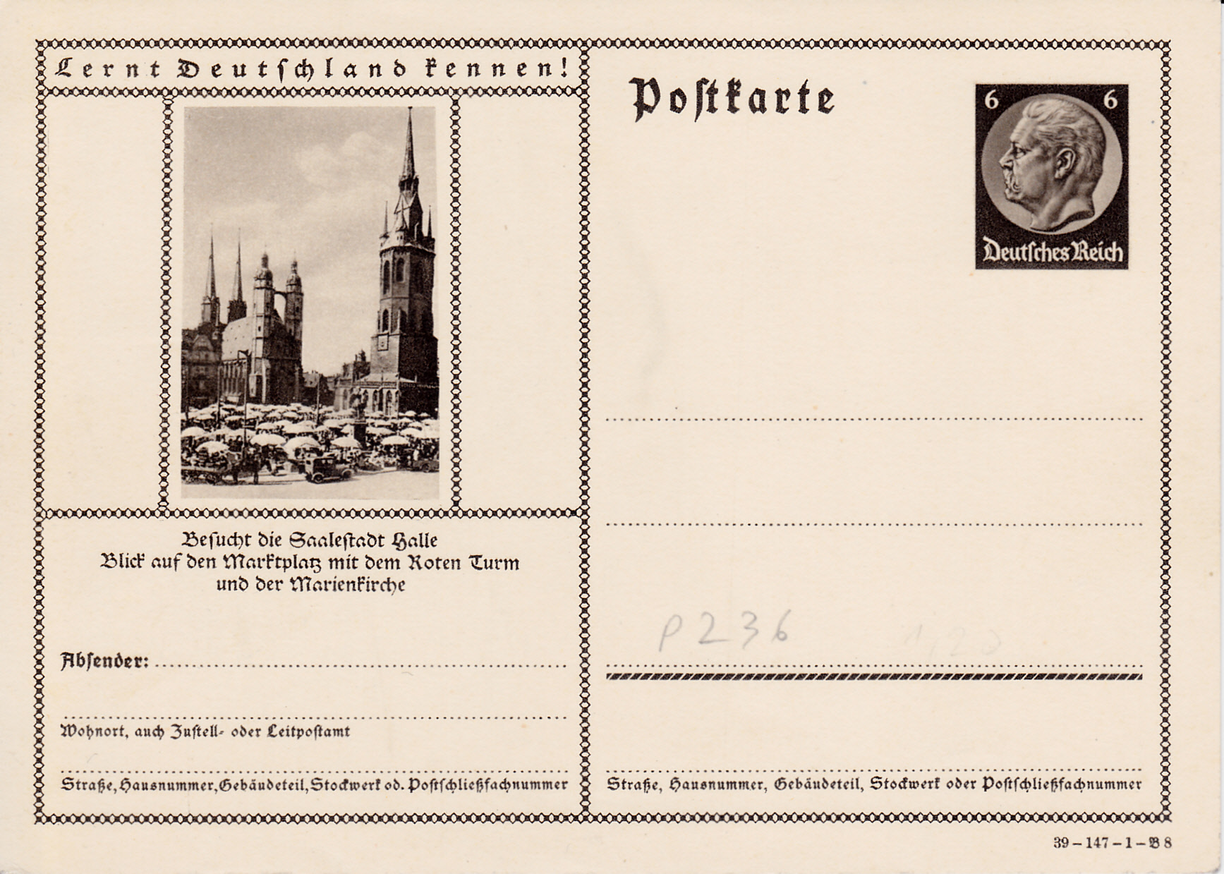 Auf einer weiteren Karte (Serie 147 Bild 8) ist der Marktplatz in Halle an der Saale mit dem Roten Turm und der Marienkirche zu sehen.