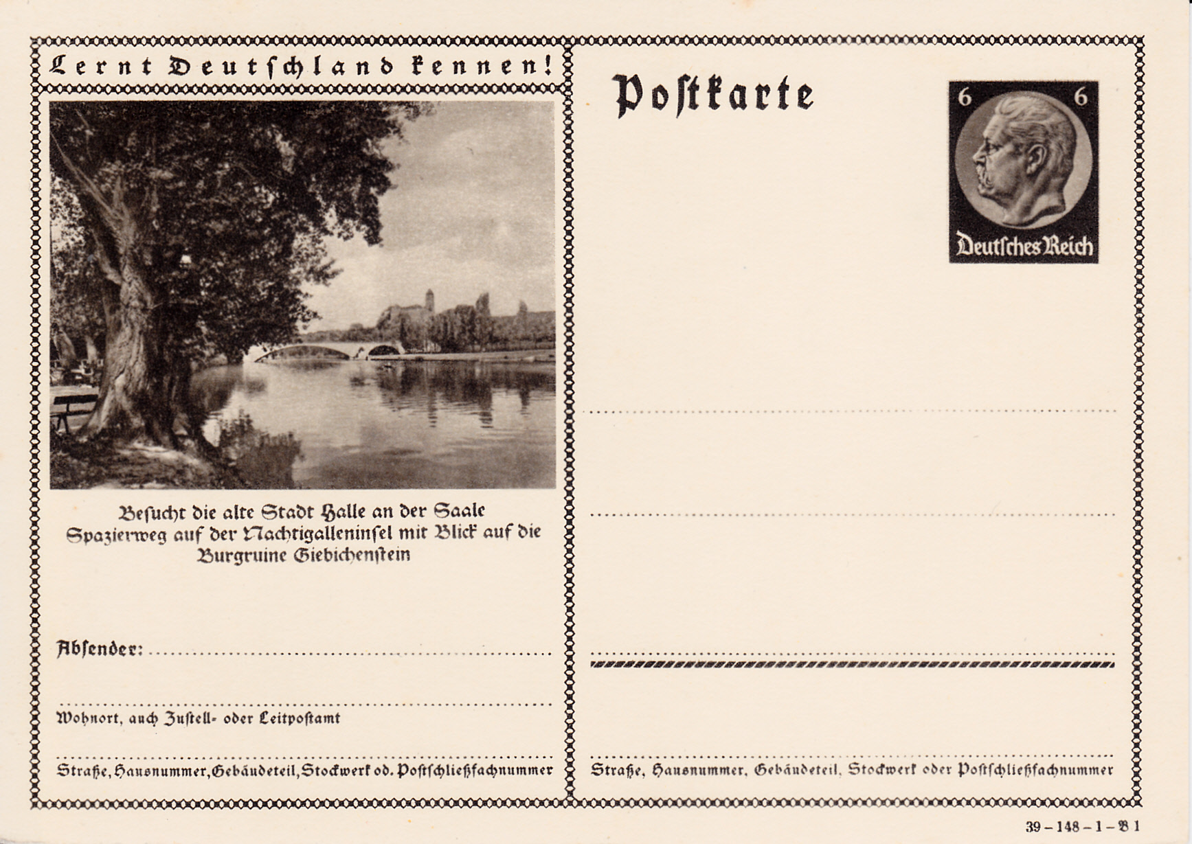 Diese Karte (Serie 148 Bild 1) ist wieder identisch bis auf den Druckvermerk mit zwei vorher abgebildeten Karten (Serie 147 Bild 1 und Serie 147 Bild 2) mit einem Blick auf die Burgruine Giebichenstein