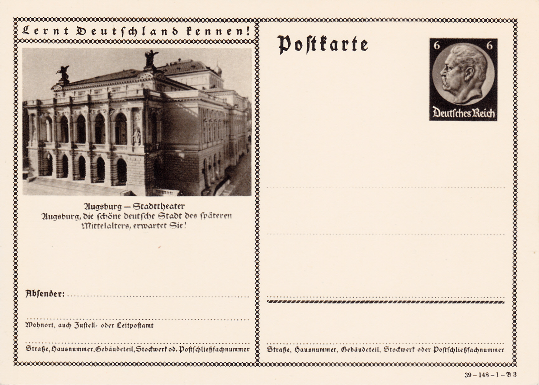 Das Stadttheater in Augsburg ist auf dieser Karte (Serie 148 Bild 3) abgebildet. Es wurde durch einen britischen Bombenangriff im Februar 1944 zerstört und in den Jahren 1952 bis 1956 äußerlich vereinfacht wiederaufgebaut.