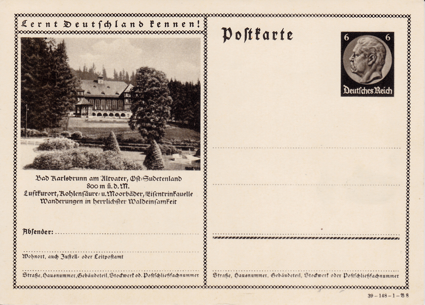 Bad Karlsbrunn am Altvater nutzt diese Karte (Serie 148 Bild 8) zur Werbung als Kurort mit Wandermöglichkeiten in der Waldeinsamkeit. Bad Karlsbrunn heißt heute Karlova Studánka ind ist ein Kurort im tschechischen Bezirk Bruntál.