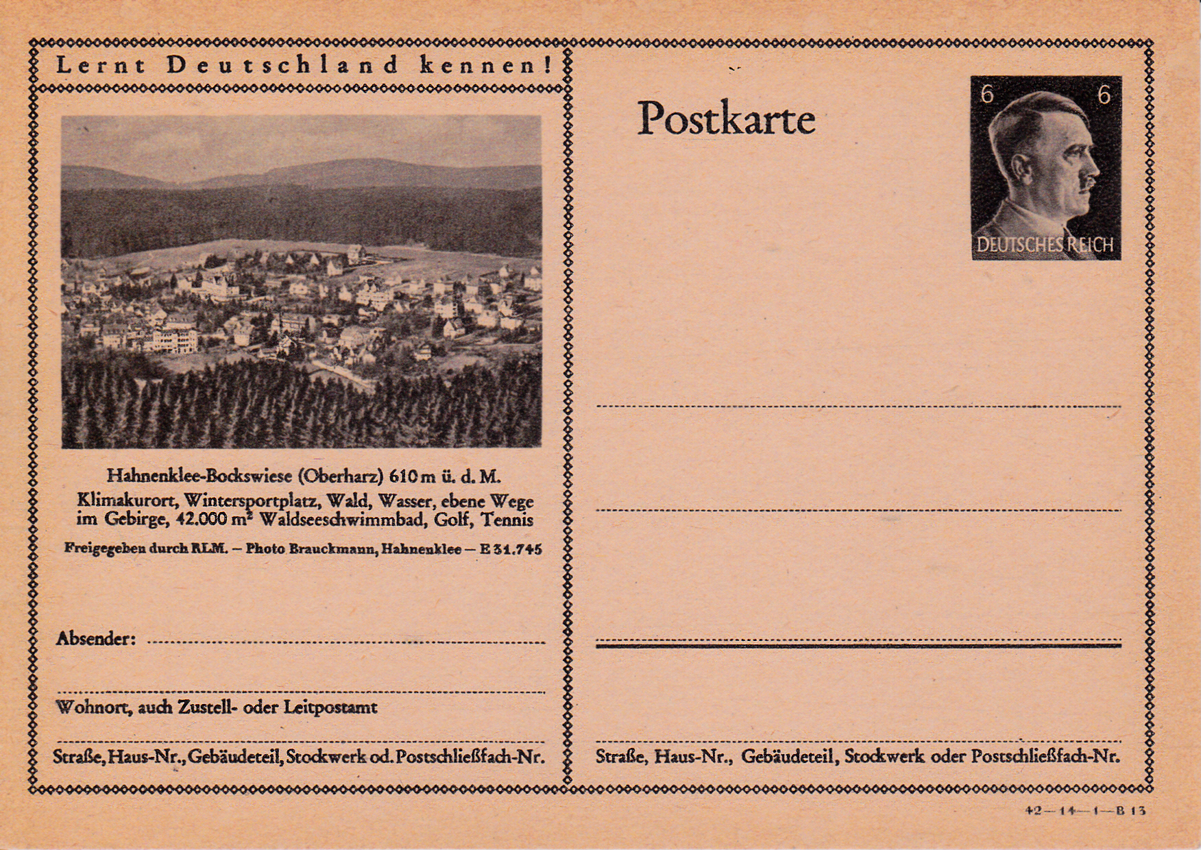 Hahnenklee-Bockswiese im Oberharz ist 1942 wieder mit einer Karte (Serie 14 Bild 13) vertreten und wirbt mit einer Luftaufnahme des Ortes als Kurort und Wintersportplatz.