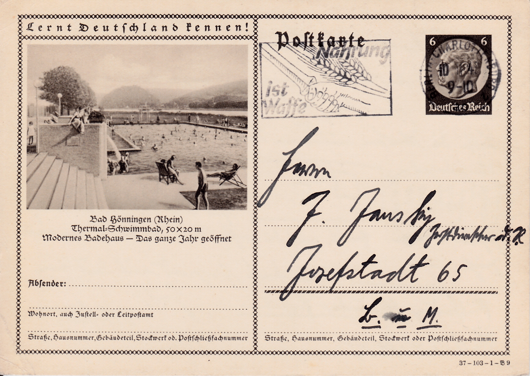 Es folgt Bad Hönningen (Rhein) mit einer zweiten bildgleichen Bildpostkarte 1937 (Serie 103 Bild 8) mit seinem Thermal-Schwimmbad.