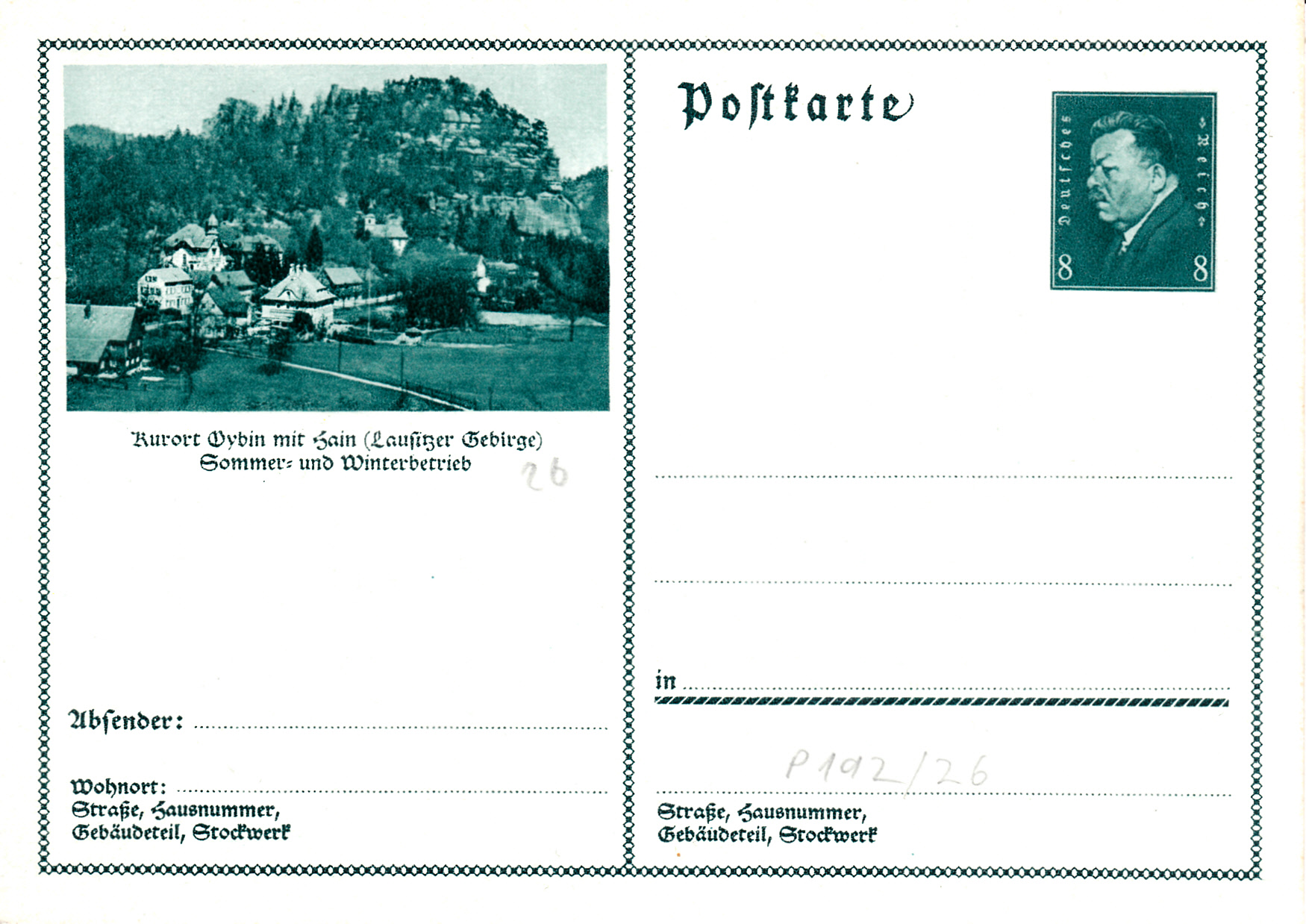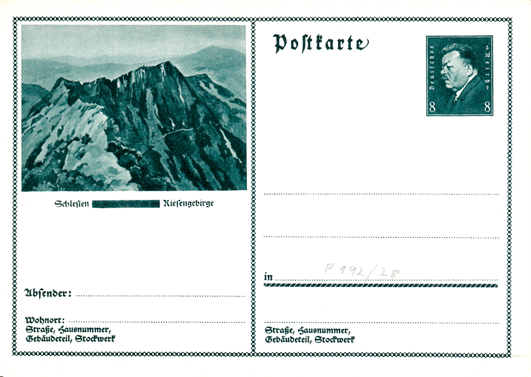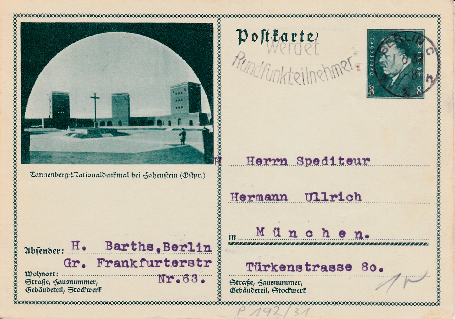 Auf dieser Karte (MiNr P 192/31) wird das Tannenberg-Denkmal gezeigt. Das Tannenberg-Denkmal (offiziell Tannenberg-Nationaldenkmal, ab 1935 Reichsehrenmal Tannenberg) wurde von 1924 bis 1927 bei Hohenstein in Ostpreußen, dem heutigen polnischen Olsztynek, errichtet. Es erinnerte an die Schlacht bei Tannenberg 1410 während der Litauerkriege des Deutschen Ordens, die Tannenbergschlacht im August 1914 und die Schlacht an den Masurischen Seen im September 1914. Die Anlage wurde von Pionieren der Wehrmacht im Januar 1945 vor der anrückenden Roten Armee gesprengt.