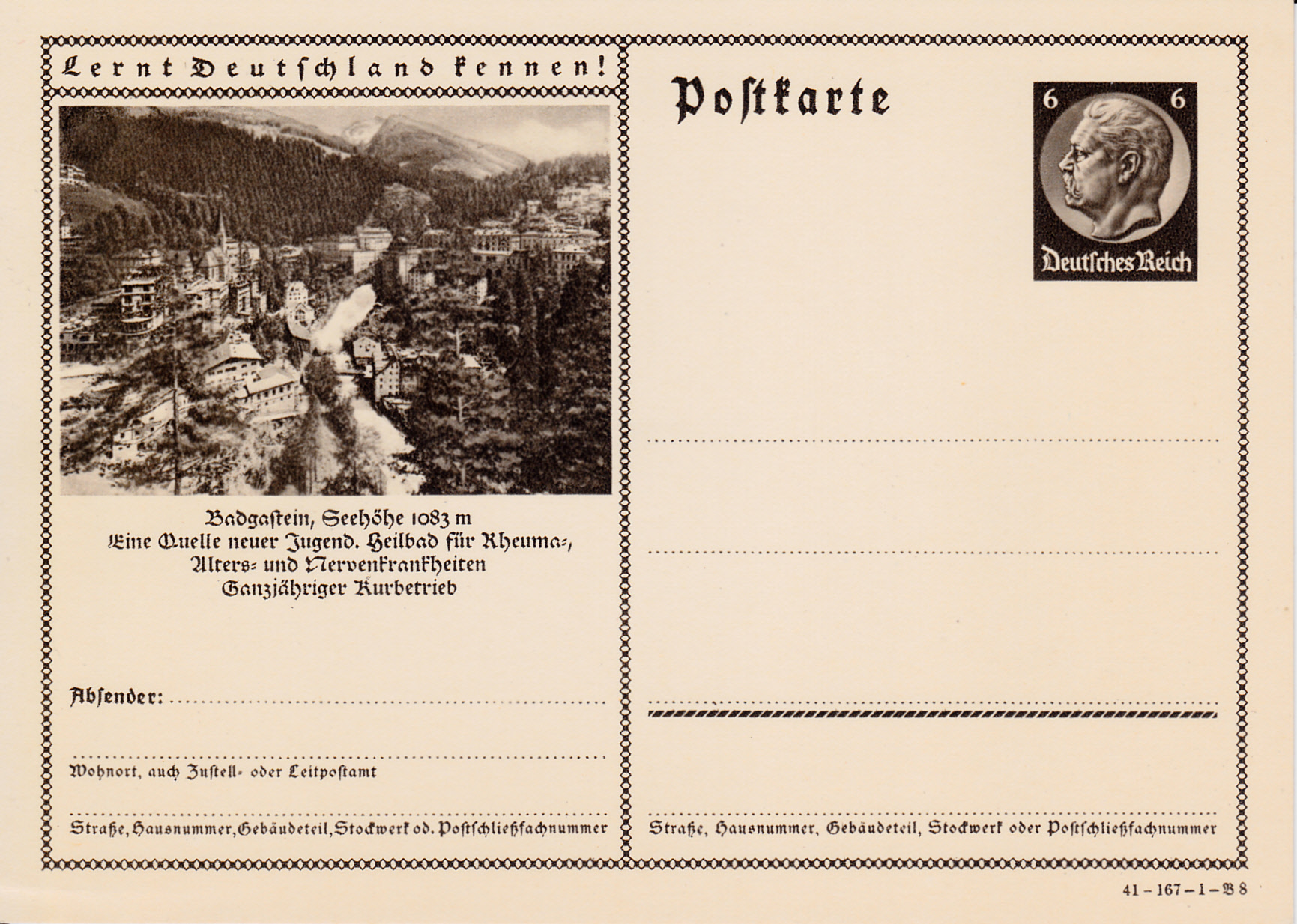 Badgastein (1906 bis 1996 hieß die Gemeinde Badgastein, heute Bad Gastein) stellt sich mit dieser Bildpostkarte (Serie 167 Bild 8) als Kurort mit ganzjährigem Kurbetrieb vor.