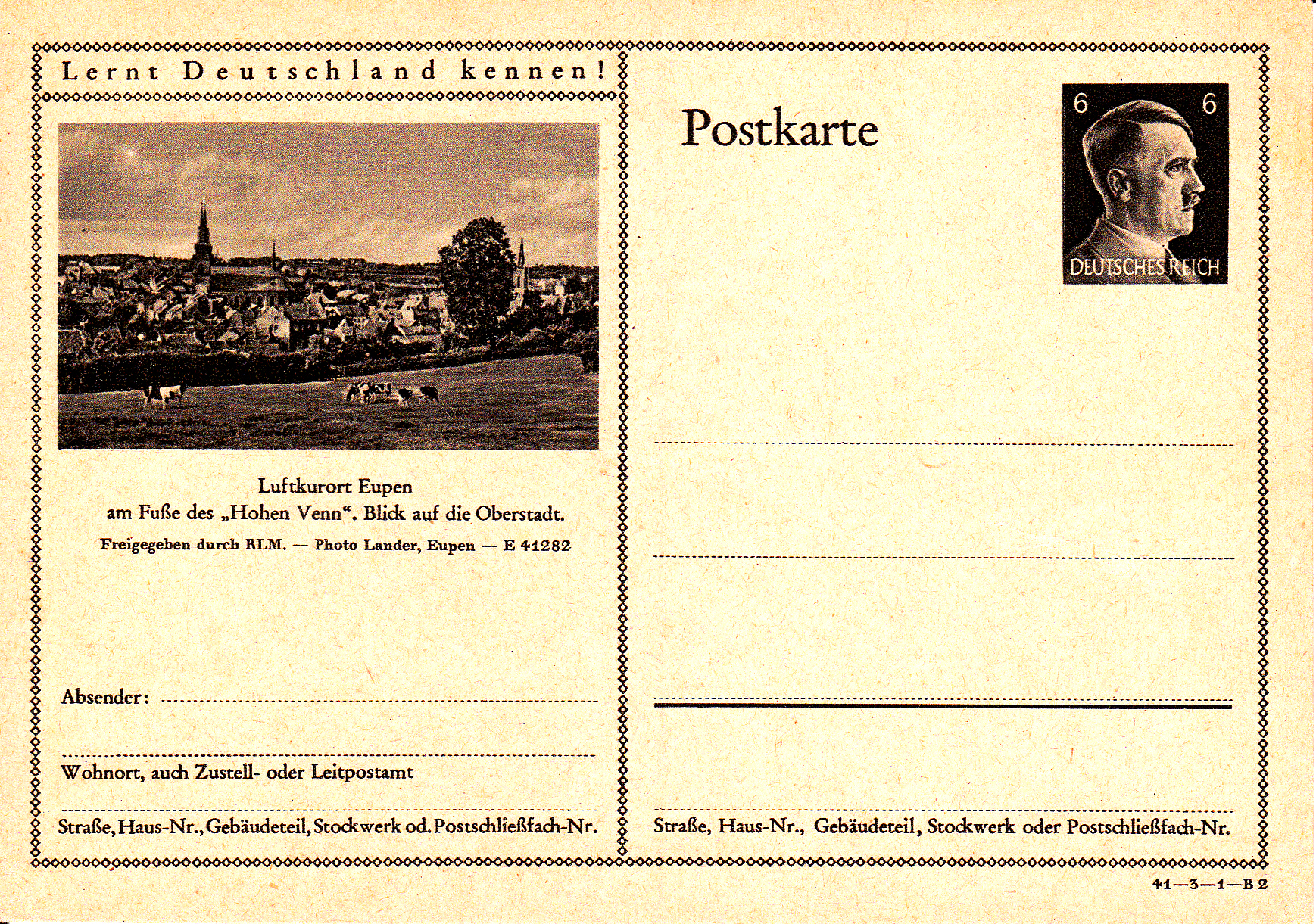 Eupen wirbt auf dieser Bildpostkarte (Serie 3 Bild 1) als Luftkurort mit einem Blick auf den Kurort. Eupen war ab 18.Mai 1940 bis Kriegsende dem Deutschen "angegliedert" worden.