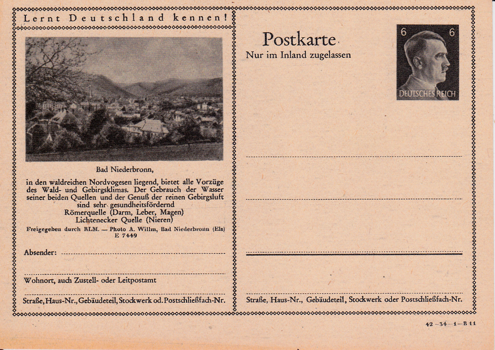 Bad Niederbronn zeigt auf dieser Karte (Serie 34 Bild 11) eine Ansicht der Gemeinde. Bad Niederbronn heißt heute wieder Niederbronn-les-Bains und ist eine französische Gemeinde im Département Bas-Rhin in der Europäischen Gebietskörperschaft Elsass und in der Region Grand Est. Der Ort ist Teil des Regionalen Naturparks Nordvogesen.