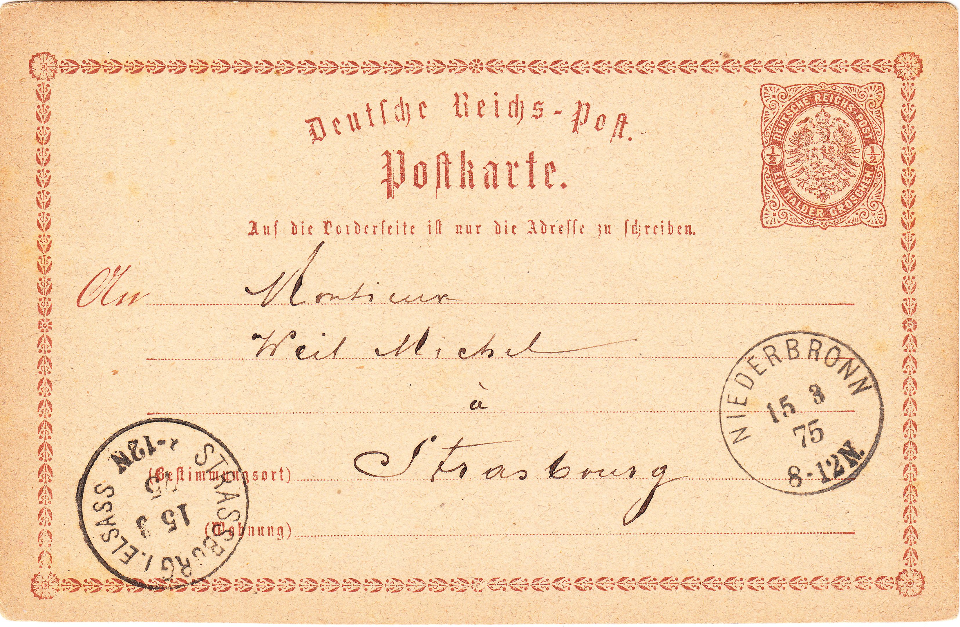 Diese Ganzsache MiNr. P 1 lief am 15.03.1875, also während der Zeit der Markwährung, innerhalb des Elsass von NIEDERBRONN nach STRASSBURG: