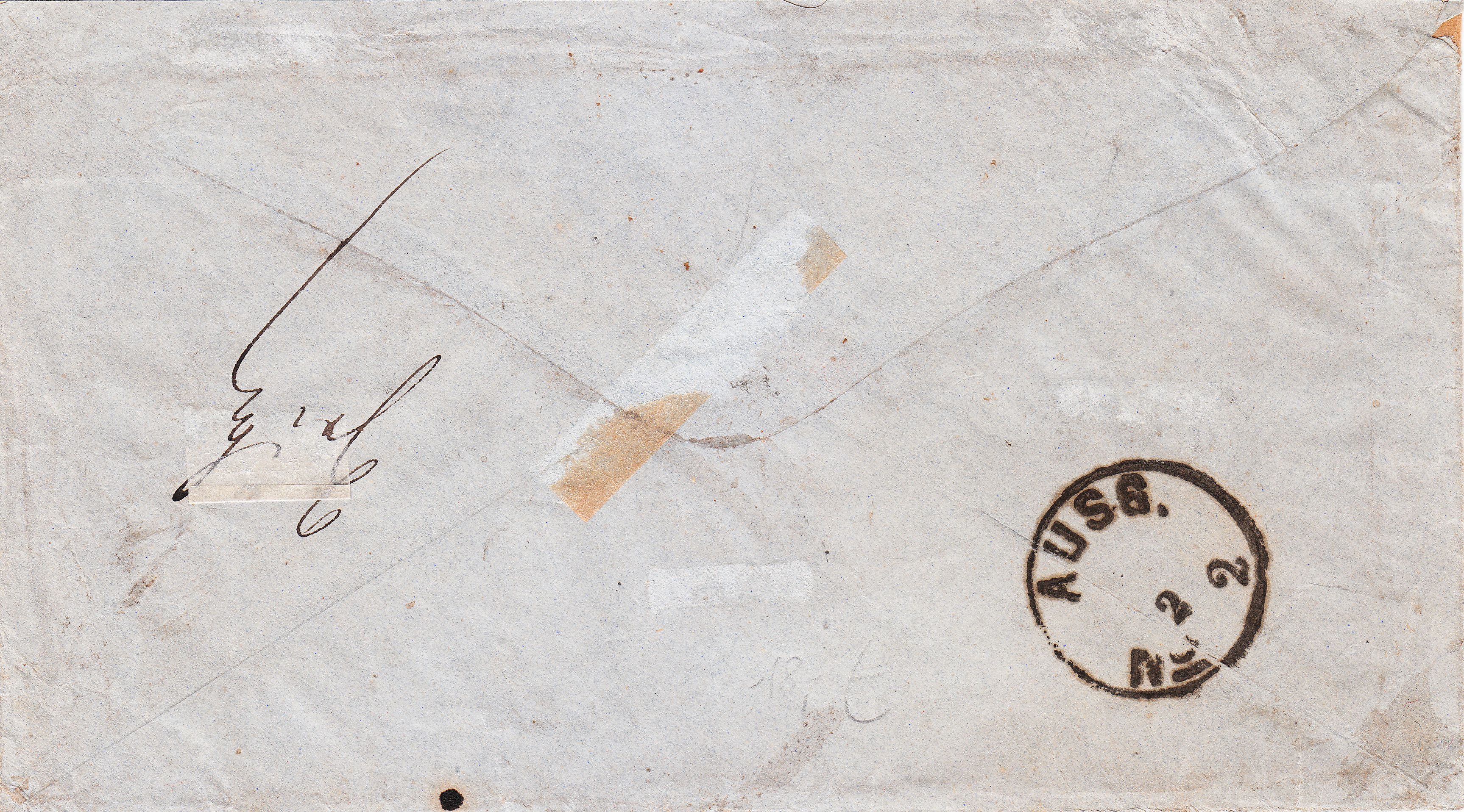 Immerhin wurde rückseitig in MARKIRCH im Elsaß als Ankunftstempel ein Hufeisenstempel mit eingedrehten Enden abgeschlagen, weshalb ich diesen ramponierten Beleg mitgenommen habe: