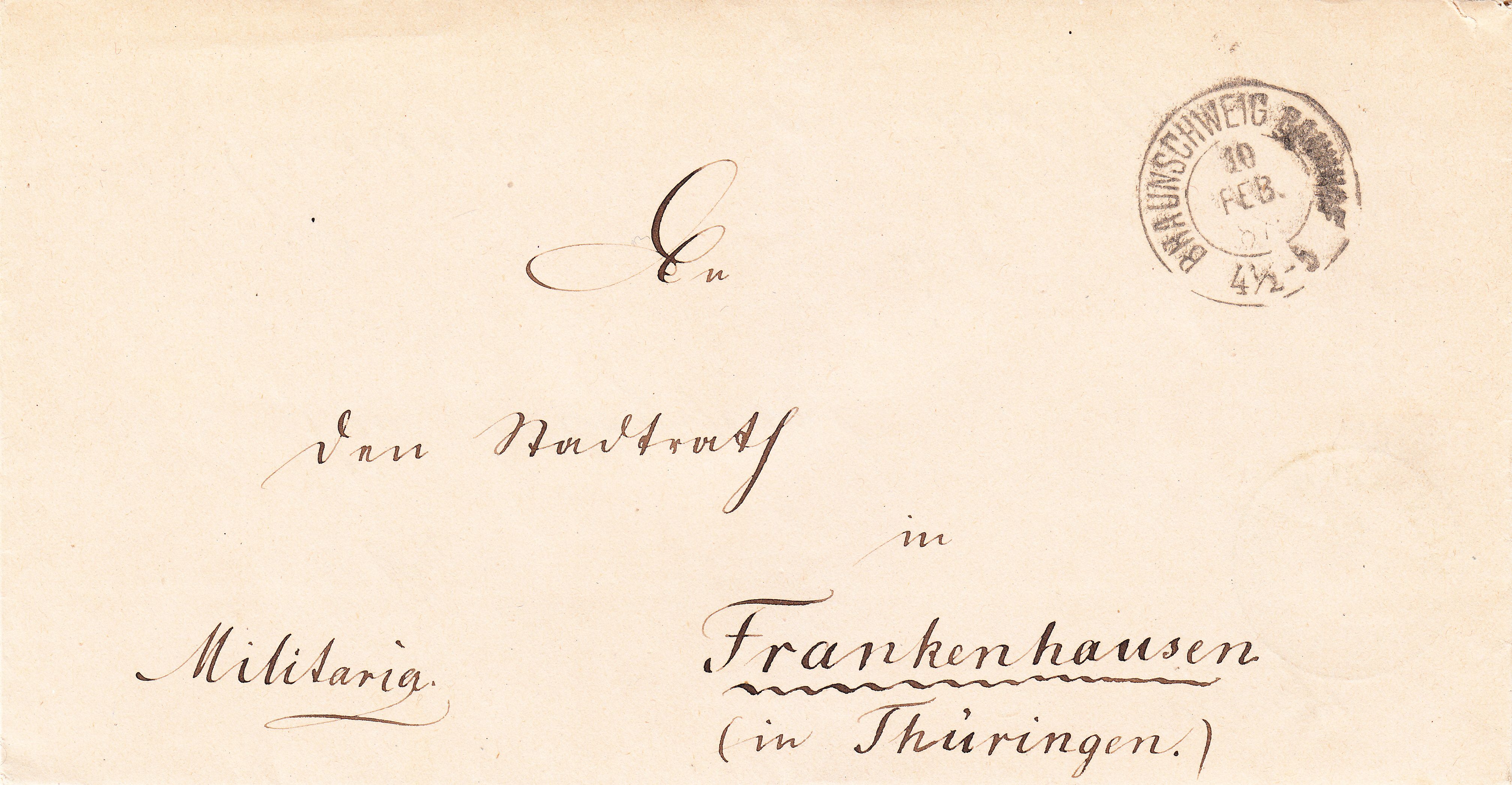 Faltet man den Briefbogen in der anderen Richtung, dann entsteht der nach Frankenhausen adressierte, in BRAUNSCHWEIG BAHNHOF aufgegegebene Antwort-Dienstbrief: