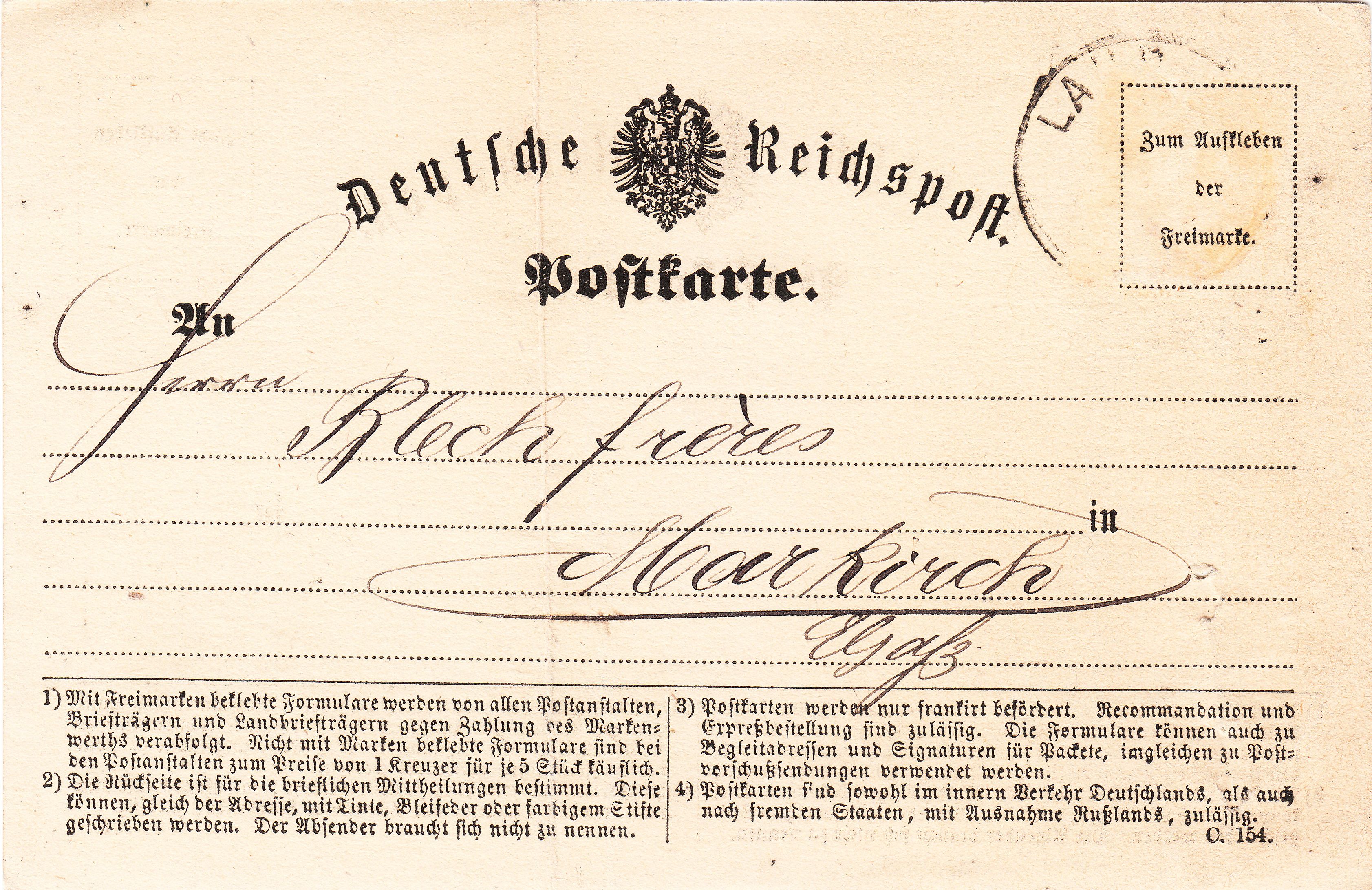Es handelt sich um ein Formular "Postkarte", aufgegeben am 15.12.1872 in LAHR in Baden.