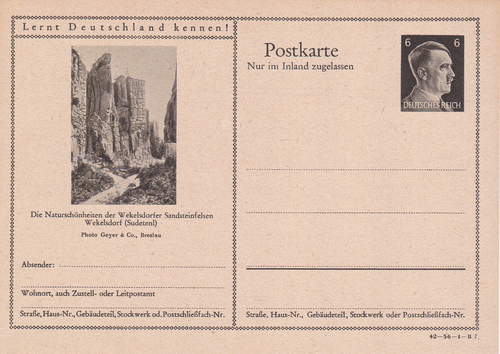 Wekelsdorf (Sudetenland) zeigt auf dieser Bildpostkarte (Serie 36 Bild 1) Naturschönheiten der Wekelsdorfer Sandsteinfelsen. Wekelsdorf heißt heute Teplice nad Metují und ist eine Stadt an der Metuje (Mettau) im ostböhmischen Okres Náchod, Královéhradecký kraj (Tschechien).