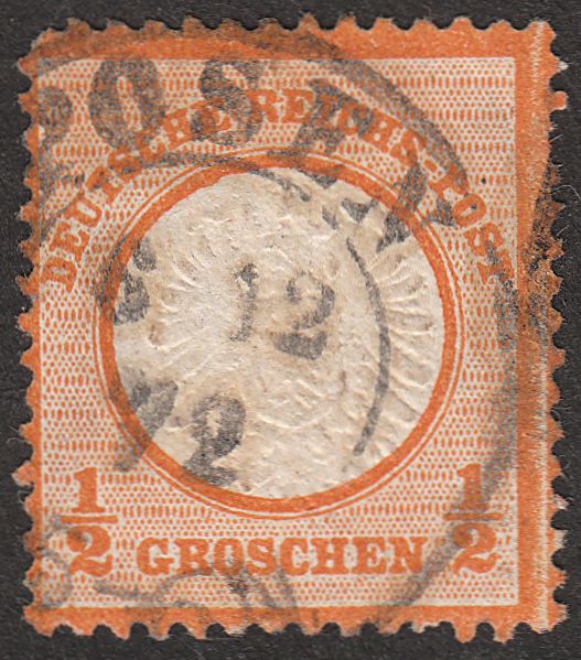 Heute eine nach links dezentrierte MiNr. 18 mit "Brustschildfuge" im rechten Rahmen, entwertet am 06.12.1872 per nachverwendetem preussischem Zweikreisstempel POSEN: