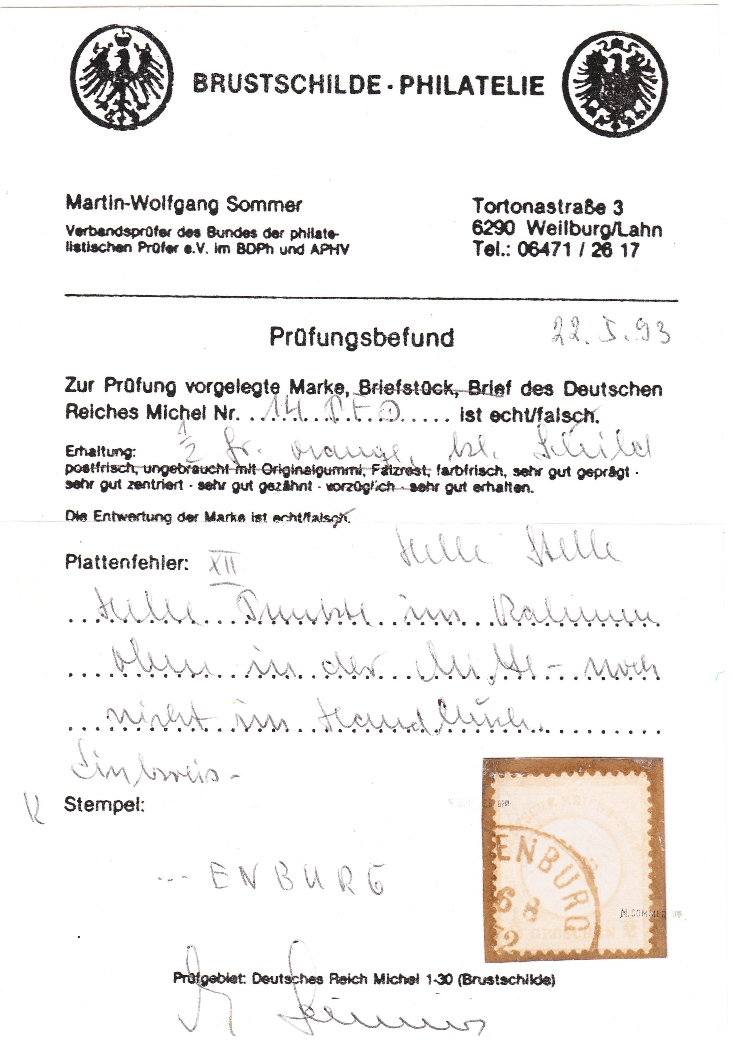 Diese MiNr. 14 XII zeigt den Plattenfehler "Helle Punkte im Rahmen oben in der Mitte":
